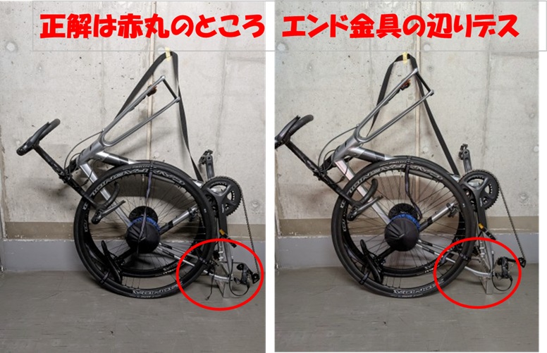 輪行パッキングを “袋に入れない状態で” した様子ですが、左右で1ヵ所違いがります。