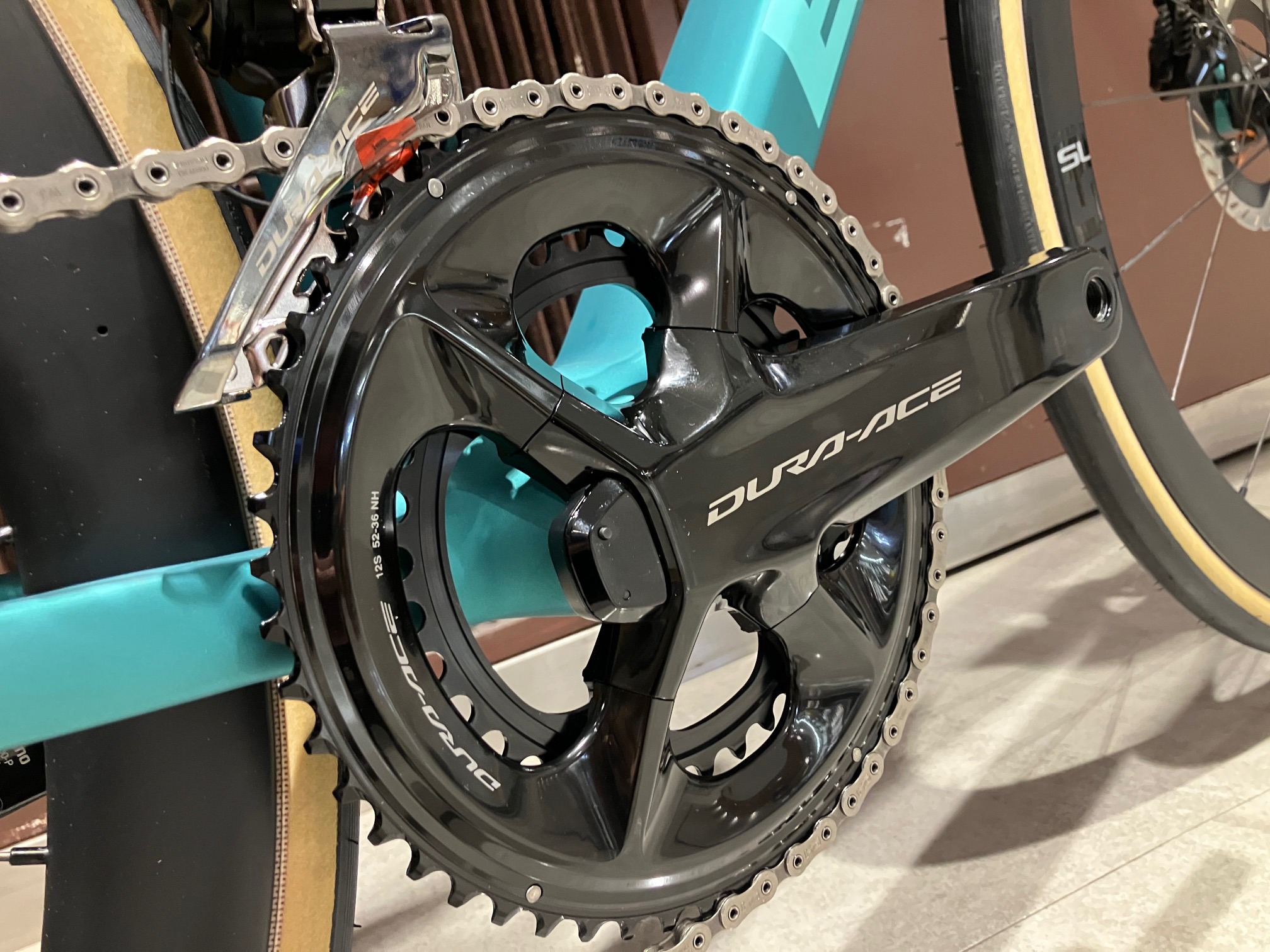 メインコンポーネントはデュラエース。クランクは純正のパワーメーター内蔵モデルなので本格的なトレーニングやヒルクライムレースでも即戦力で使えますね。