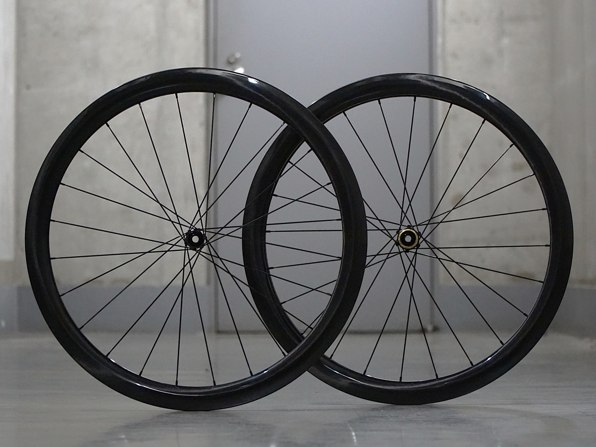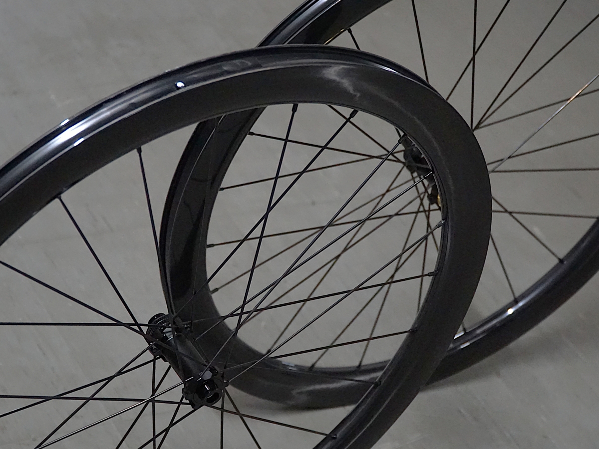 リムハイトはオールラウンドに使える軽さと空力を兼ね備えた45mm、取り付けた時に見た目のバランスも良く、またカーボン地を活かしたグロスブラックは美しくシンプルなのでロードバイクのデザインを選ぶことなく合わせられますよね。