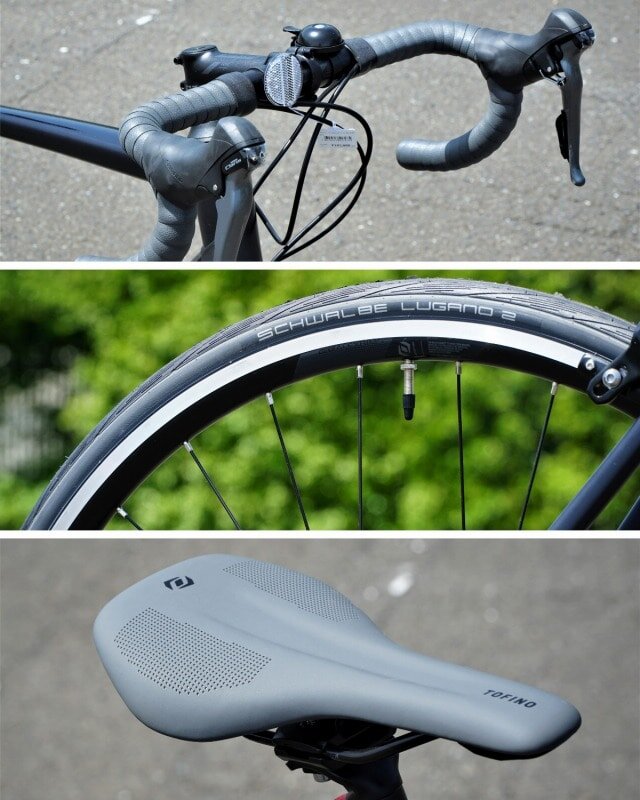 エントリーモデルと言えばオールブラックでコーディネートされがちですが、SCOTT SPEEDSTERはバーテープ・サドル・タイヤは同色のグレーに統一。