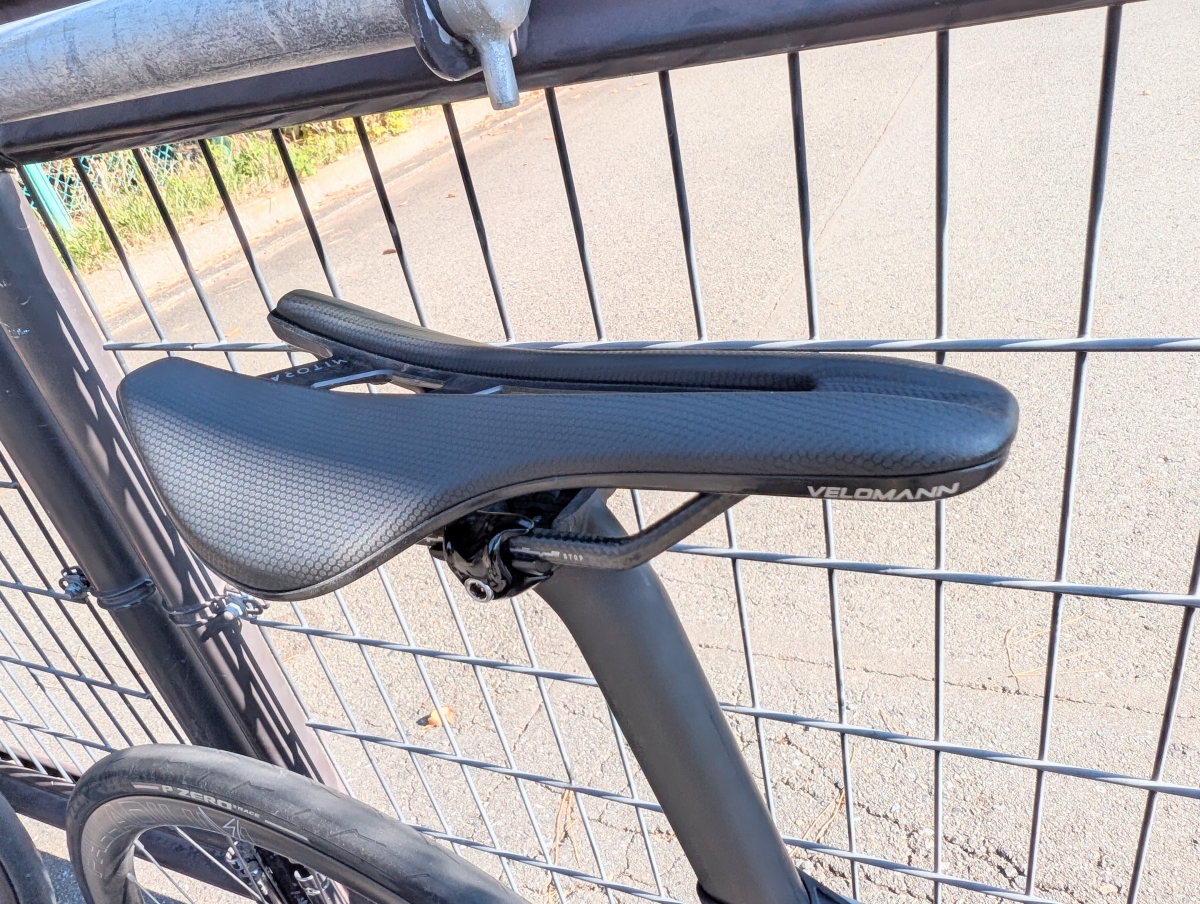 サドルはPROのサドルと同形状ですが、表皮の素材が変更されレールが金属製になるVelomann Mitora H1 139。重量は約220gとなります。