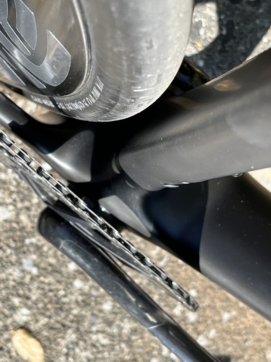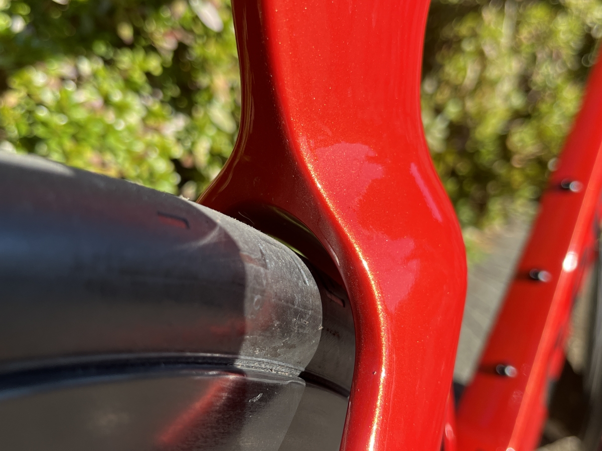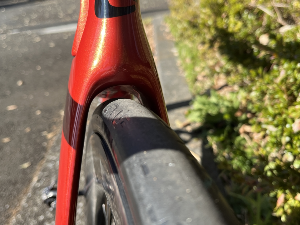 フロントフォークやフレームとのタイヤクリアランスは、700x29Cのタイヤを装着している状態で比較的詰まっています。