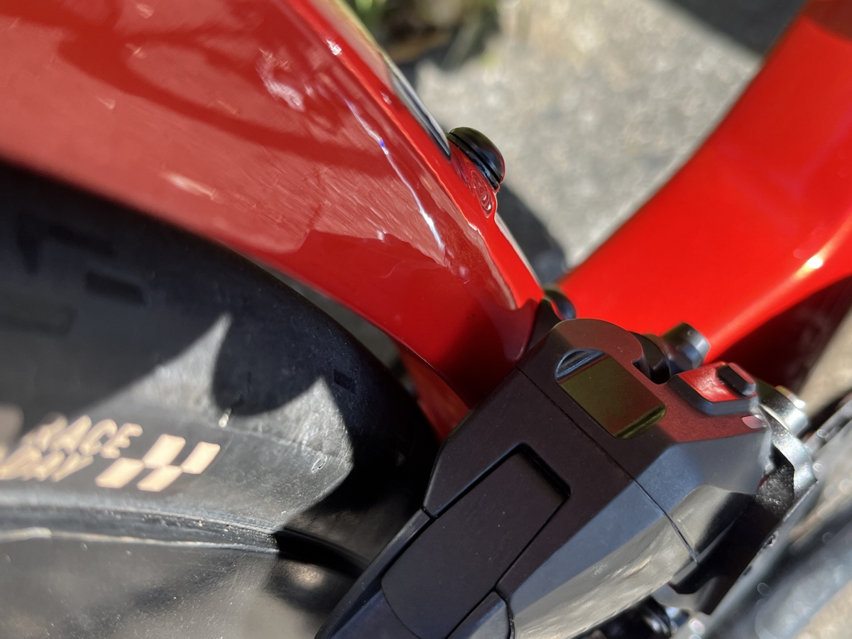 S5と言えばこの特徴的なハンドル・ヘッドチューブ周りが印象的です。今回のモデルチェンジでこのヘッドチューブ・フロントフォーク周りの形状がアップデートされ、より空力性能に優れたバイクへと進化しました。近年の高速化するレースで使用するバイクにおいては、空力性能の向上は非常に大きな意味を持ちます。