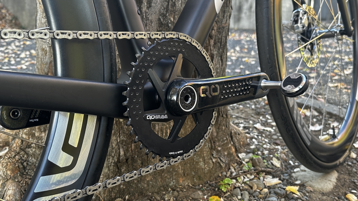 QO社のGRAVAクランクセットも好調でカーボンクランクらしい粘りのある踏み心地は、フレームの特性と相まってより好感触に。デザインもイケてますね。