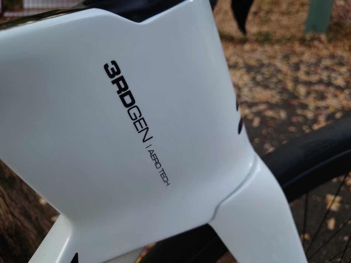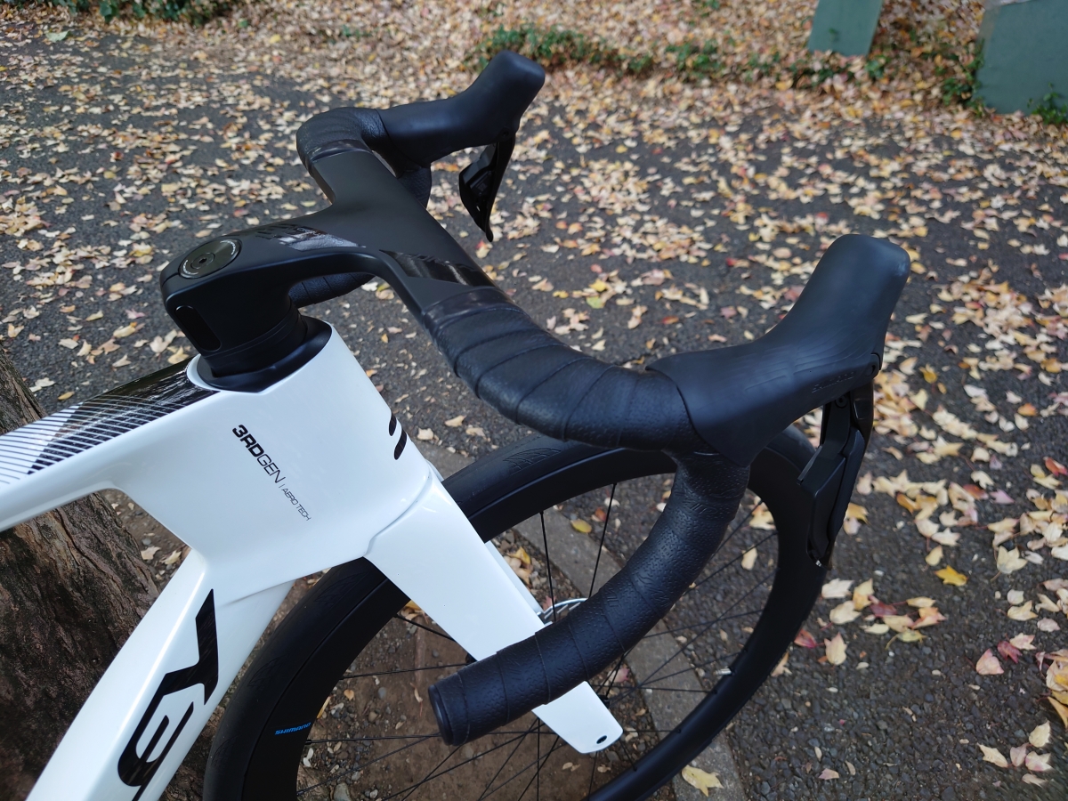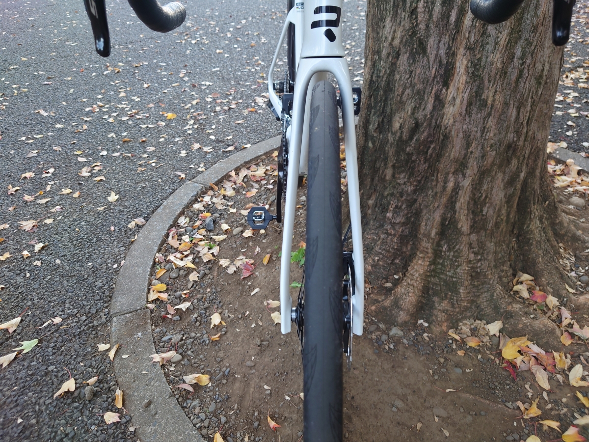漕ぎだしや加速時はフレームの重さを感じたりもしましたがスピードが乗ってしまえばそんなことはなく、巡航やスピードの維持は楽に感じました。空力性能が非常に高いおかげで軽く回していてもしっかり進みます。極厚のBB付近の形状から剛性の高さを想像していましたが思ったよりも足に優しい印象でした。エアロロードらしさがありながらとがりすぎておらず扱いやすい車体です。カスタム次第でレースで勝てる自転車にもなりますし、エアロロードがかっこよくて乗りたいけどレースには出ないという方にもおススメです。