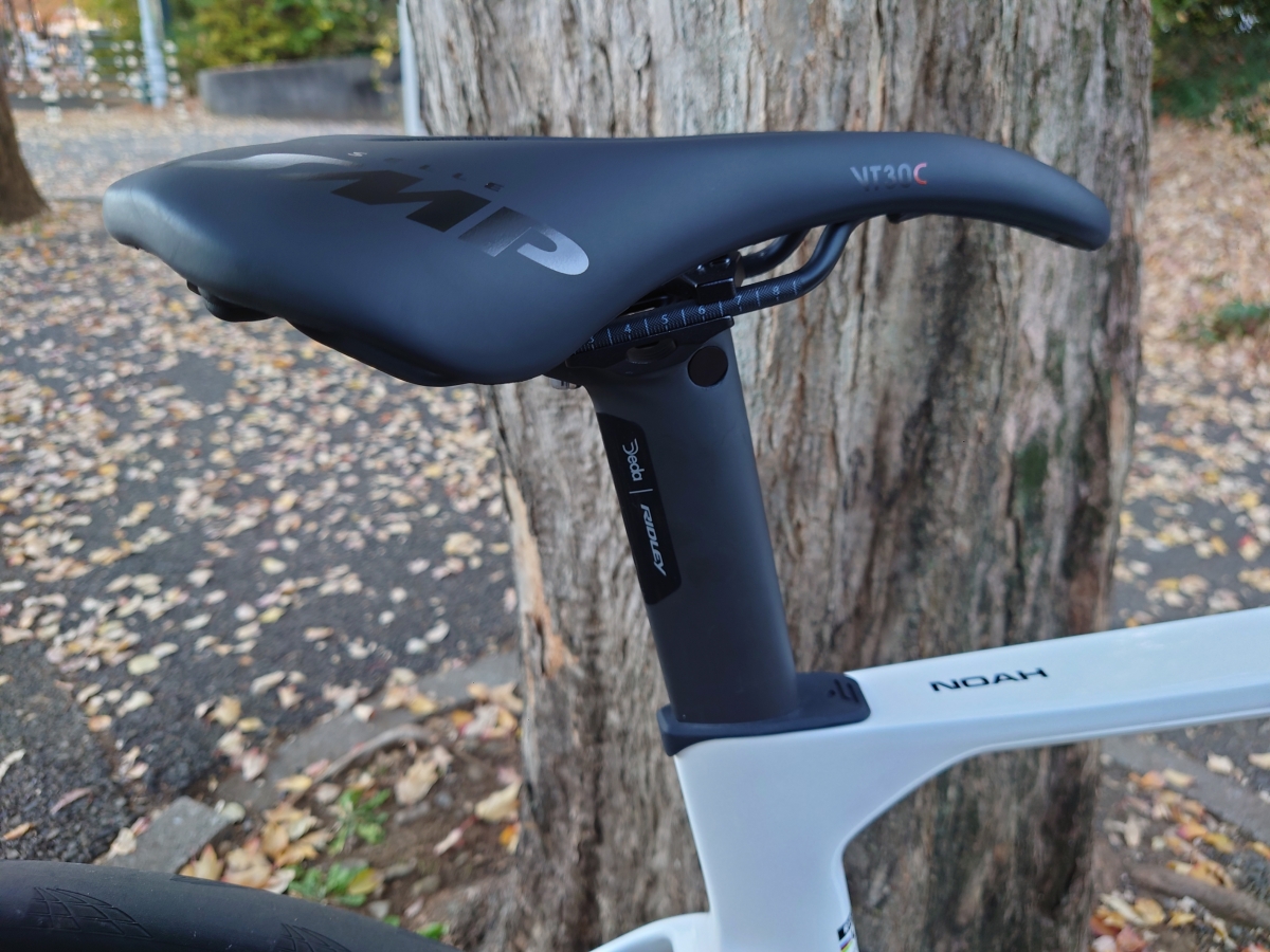 サドルはSELLE SMPのVT30C。局部の圧迫を避けるために大きくしているセンターの穴やノーズの下がり具合は実にSMPらしいですが座面はフラットで体重移動をしやすいようになっています。ショートノーズサドルです。