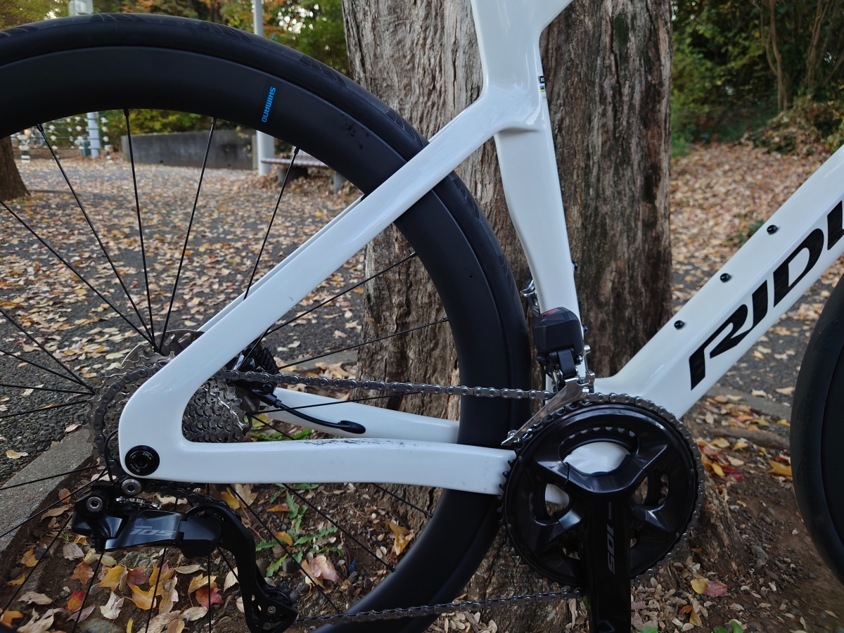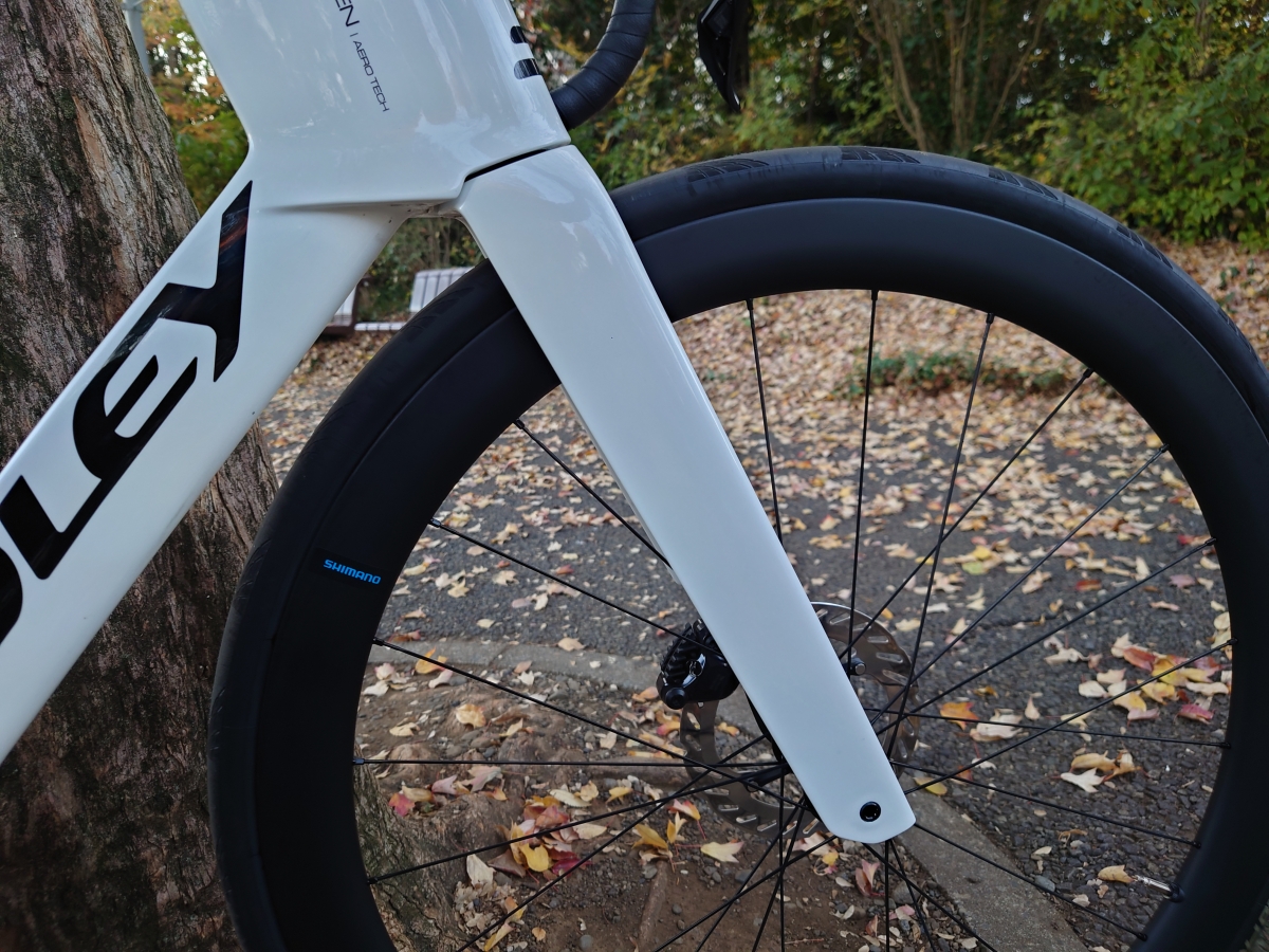 ホイールはSHIMANO WH-RS710 C46です。メインコンポと同じく105グレードのカーボンホイールでこちらもコストパフォーマンスに優れています。リムハイトは46mm、重量は前後で1612gと少し重めですが数値を見て抱いた印象よりも漕ぎだしは軽く感じられました。スピードが乗ってからの巡航もそれなりにしやすく、カーボンホイールとして十分な性能を持っています。レースなどで1分1秒を争うような走りをしないのであればこれで十分といった印象です。