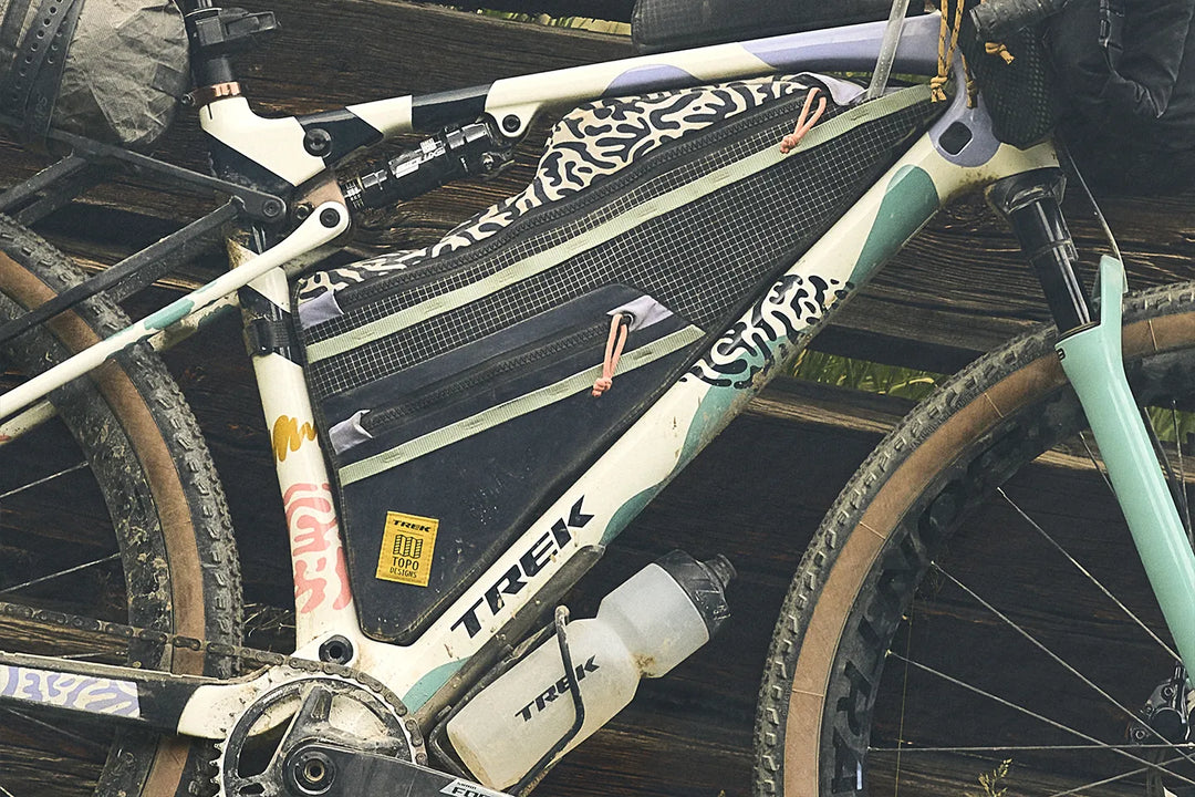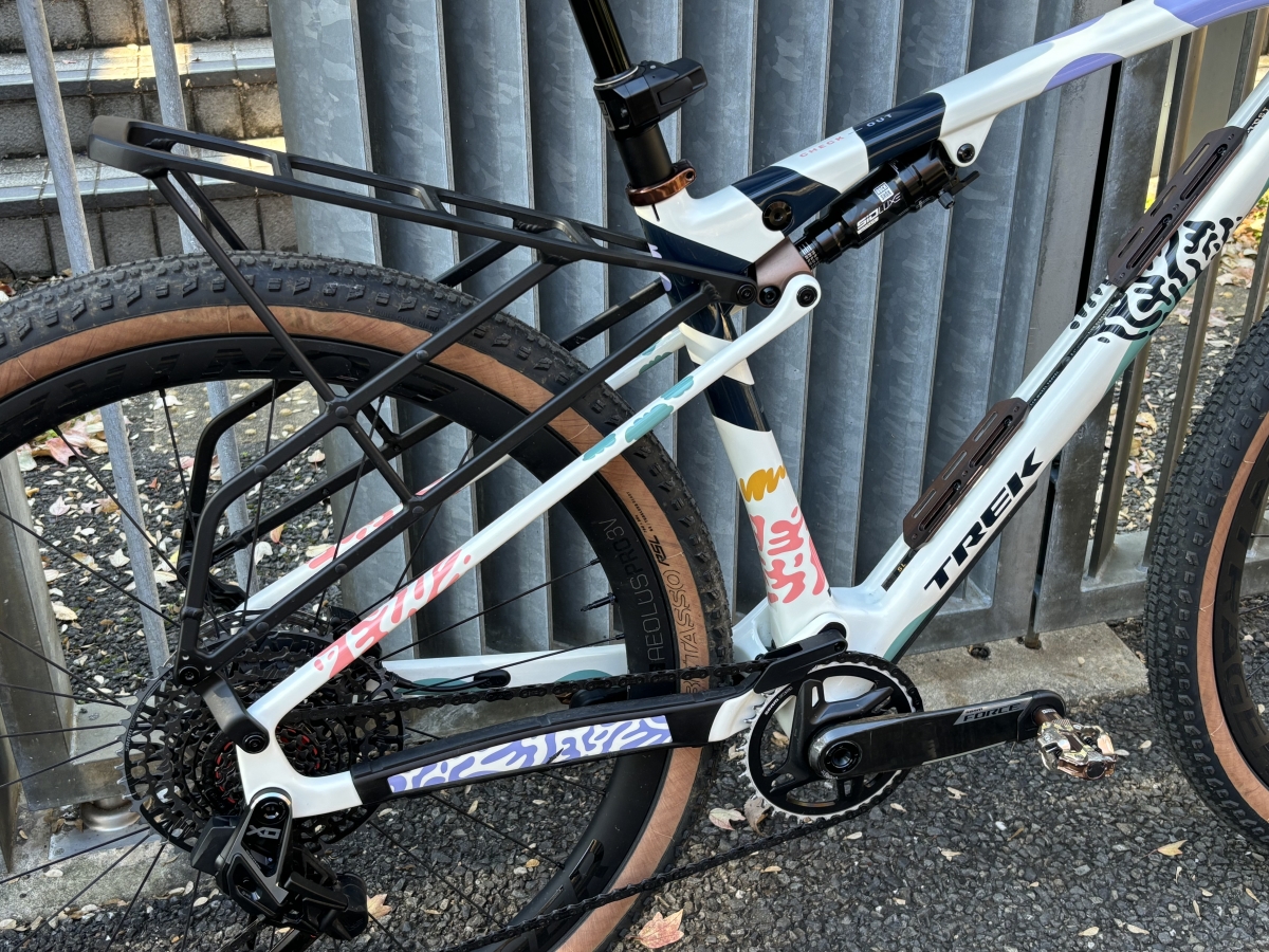 チェックアウトは、最初から「旅」を想定して設計されています。フレーム全体には 18か所ものマウントポイントが用意されており、ボトルケージ、フレームバッグ、トップチューブバッグ、フォークバッグなど、用途に応じた自由な装備が可能です。特に特徴的なのが、サスペンションと連動して動く専用リアラック。荷物を積んだ状態でもサスペンションの動きを妨げにくく、フル積載でも走行性能が破綻しにくい構造になっています。バイクパッキングや長距離ツーリングを考えている人にとって非常にオススメのスペックだと思います。信頼できますね。あと、topo designsから作られている専用のフレームバッグがすげー可愛いです。