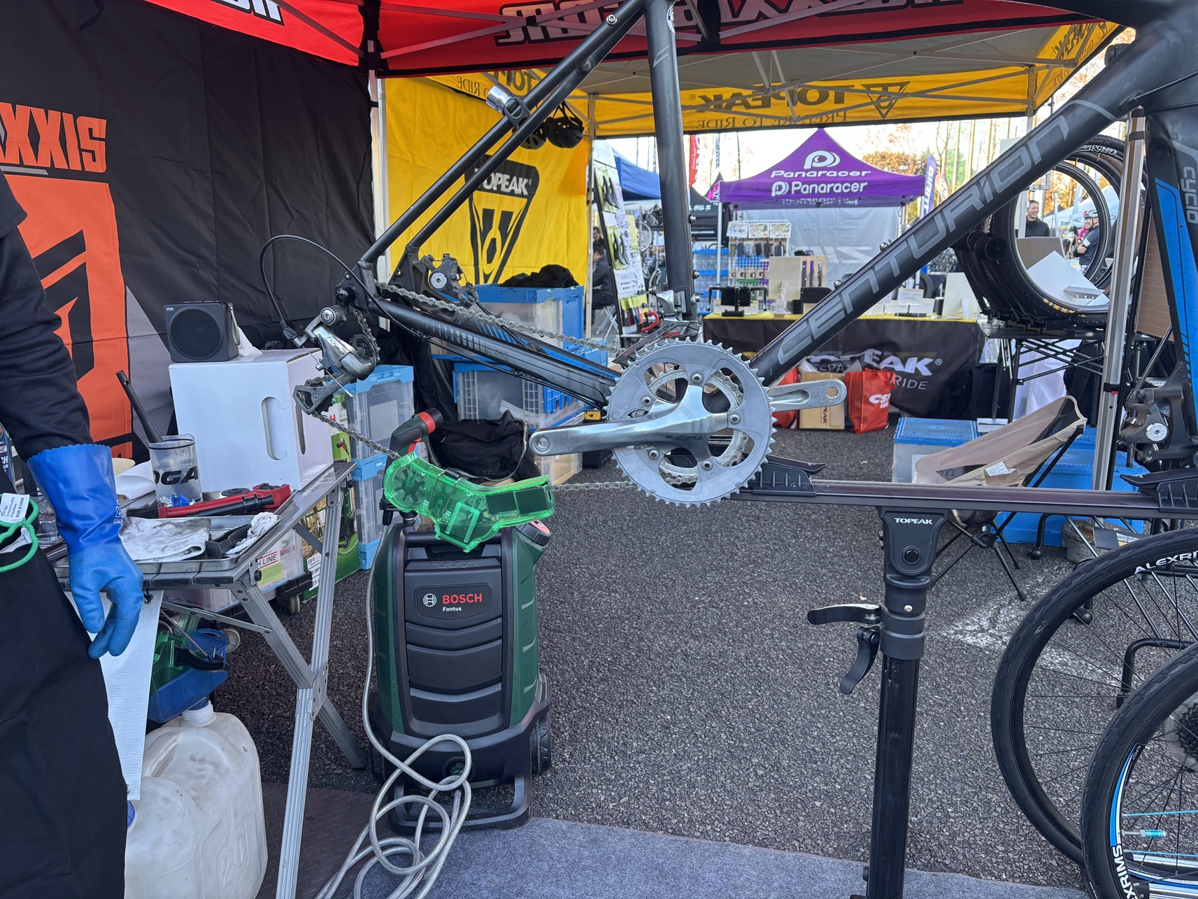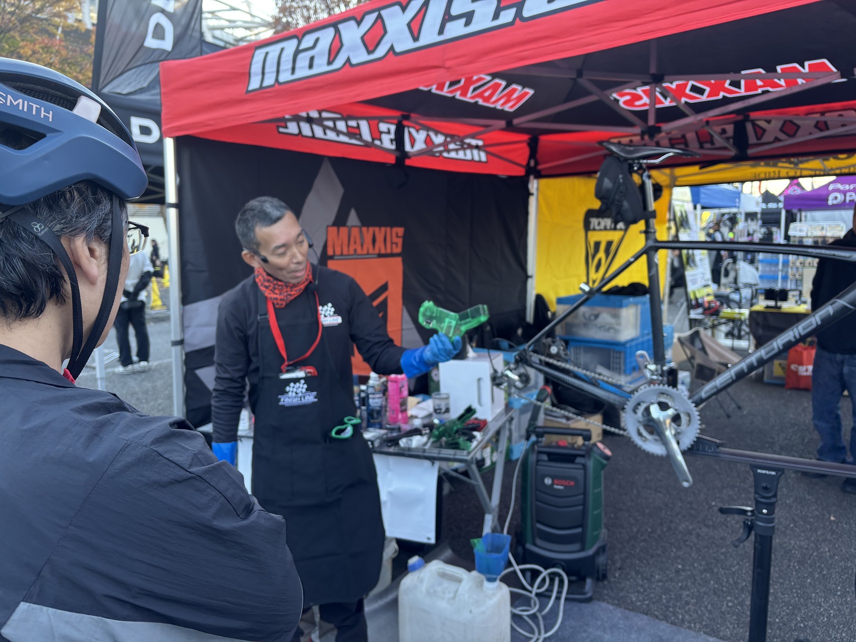 FINISH LINEさんの実演ではディグリーザーを入れてチェーンを洗浄したあと、中性洗剤などを少量まぜた水をクリーナー本体にいれかえ洗浄、そのあとに水のみを入れ洗浄するのが良いと説明されていました。洗浄中は多少チェーンについた水が下に垂れますが、水は多く使用することはなく車体の下に新聞紙をしいたり、ベランダなどのちょっとしたスペースがあれば作業が可能かと思います。