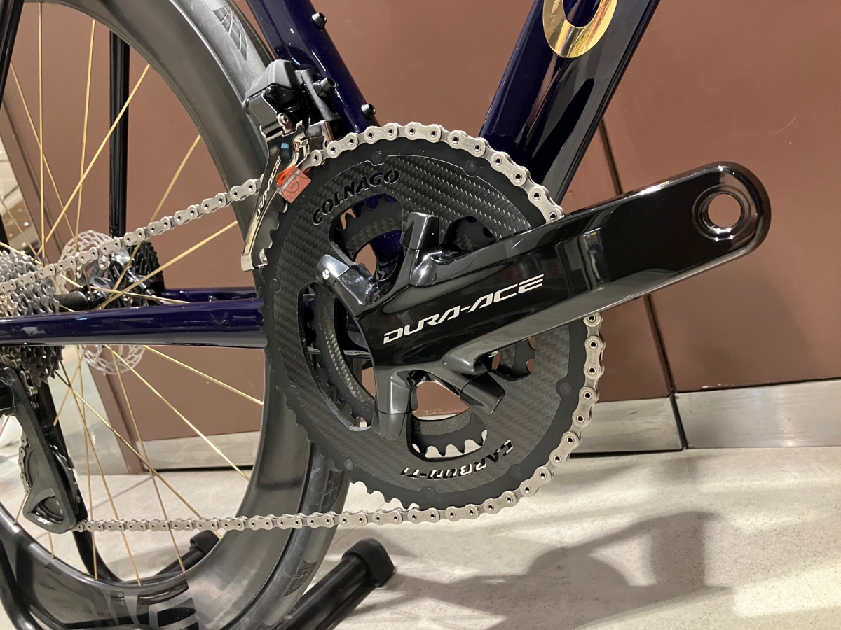 チェーンリングにはCOLNAGOロゴの入った特別なCARBON-Tiのチェーンリングをおごり、美しいカーボンの輝きが車体の美しさをより一層引き立てております。自分も先日使い始めたばかりですが、サードパーティー製のチェーンリングながら変速性能は高くストレスの少ない変速が楽しめます。