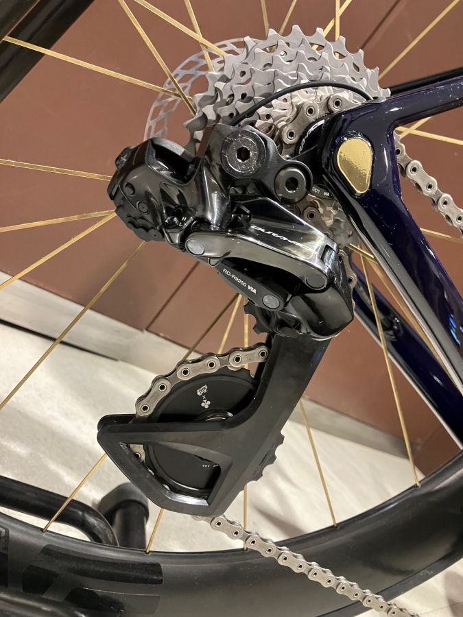 リアディレイラーには特別なグラフィックのセラミックスピードのビックプーリーが採用されています。
