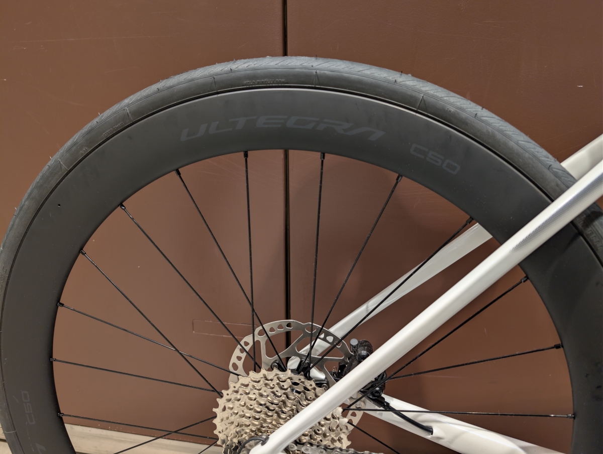 ホイールはWH-R8170-C50をオリジナルアッセンブルしており、平坦から緩斜面まで高い性能を発揮してくれます。またリムハイトが50mmと高めのホイールとなっているため平地での伸びが気持ちよく、高速域での巡行が楽です。