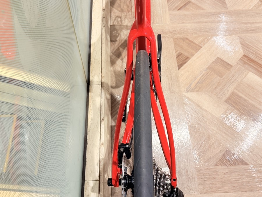 バランスよく走るための非対称形状。PINARELLO曰く「両方のペダルに掛かる推力は同じでも、チェーンを引っ張る力は右側にしか掛からない。フレーム全体においてこの偏った力を補正するように最適化したデザインを取り入れている。」との事。見た目も美しく走りも考えた設計が人気の秘密かもしれません。