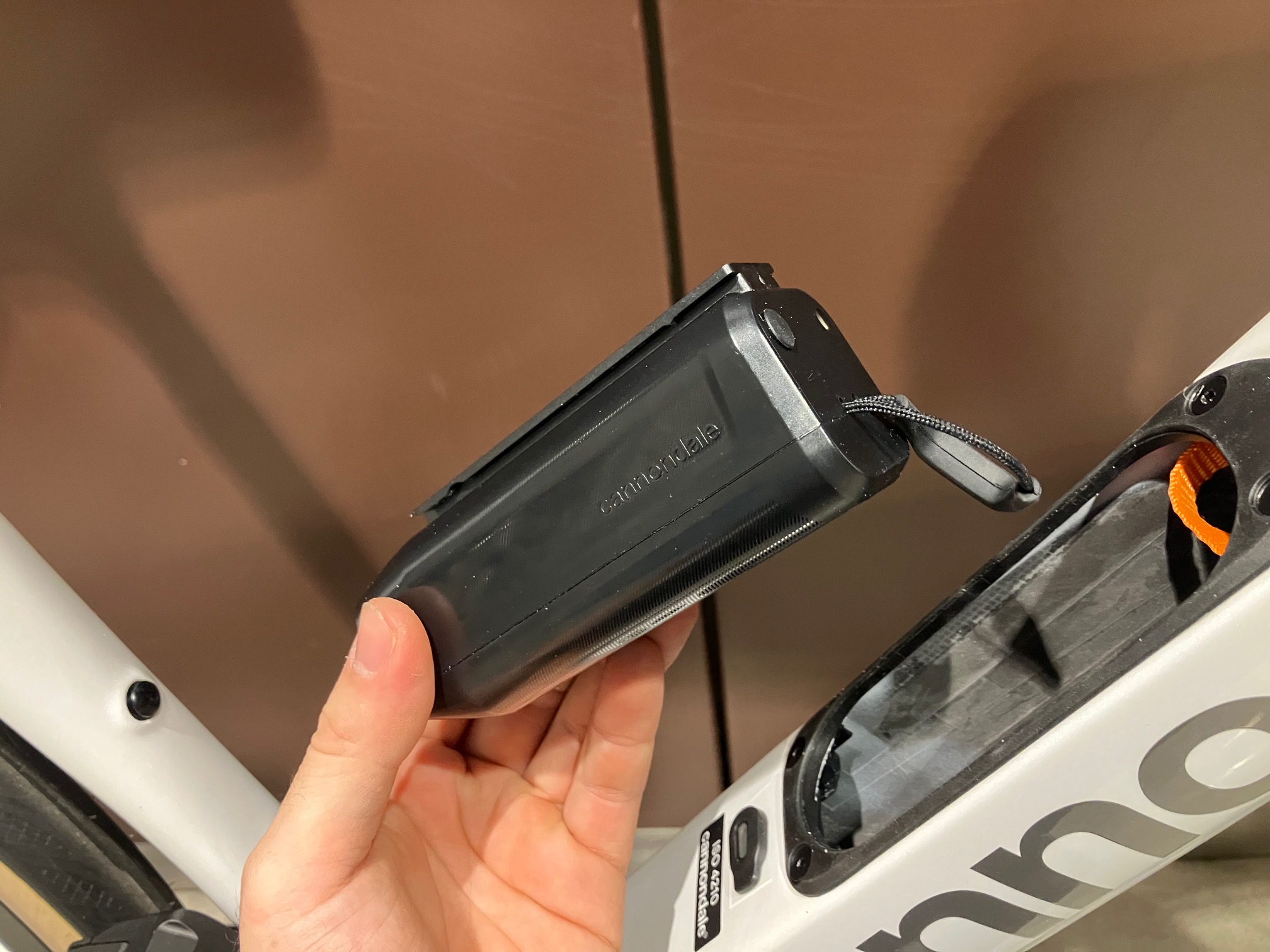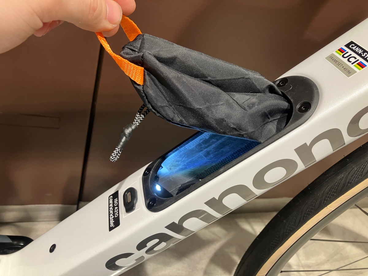 ダウンチューブには広めのストレージも完備。ツールなどを収められる専用ポーチが付属しストレージ下部にバッテリーが収まります。