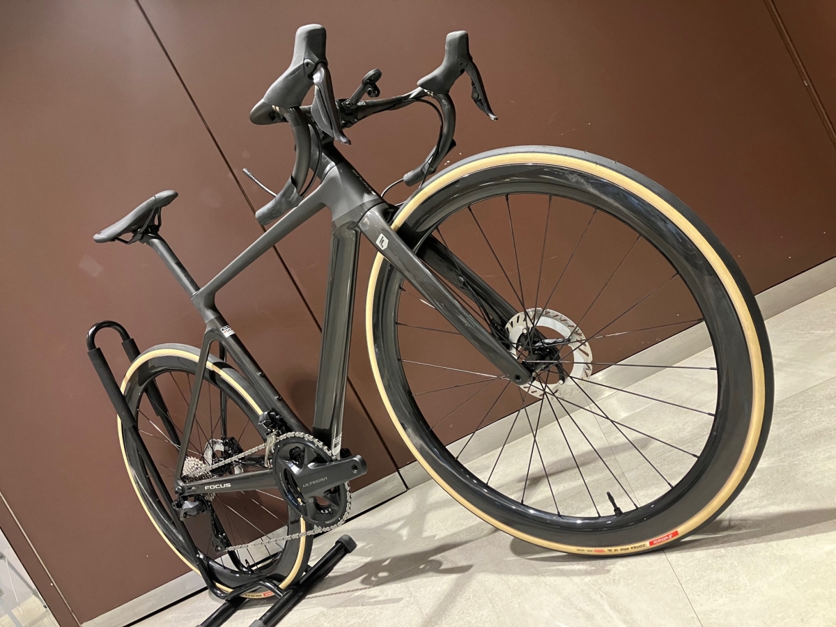 そのままの仕様でも十分スペックの高いアルミホイールが装着されていますがリムハイトの高いカーボンホイールに変更するとより一層、フレームの空力性能を引き出せるかと思います。