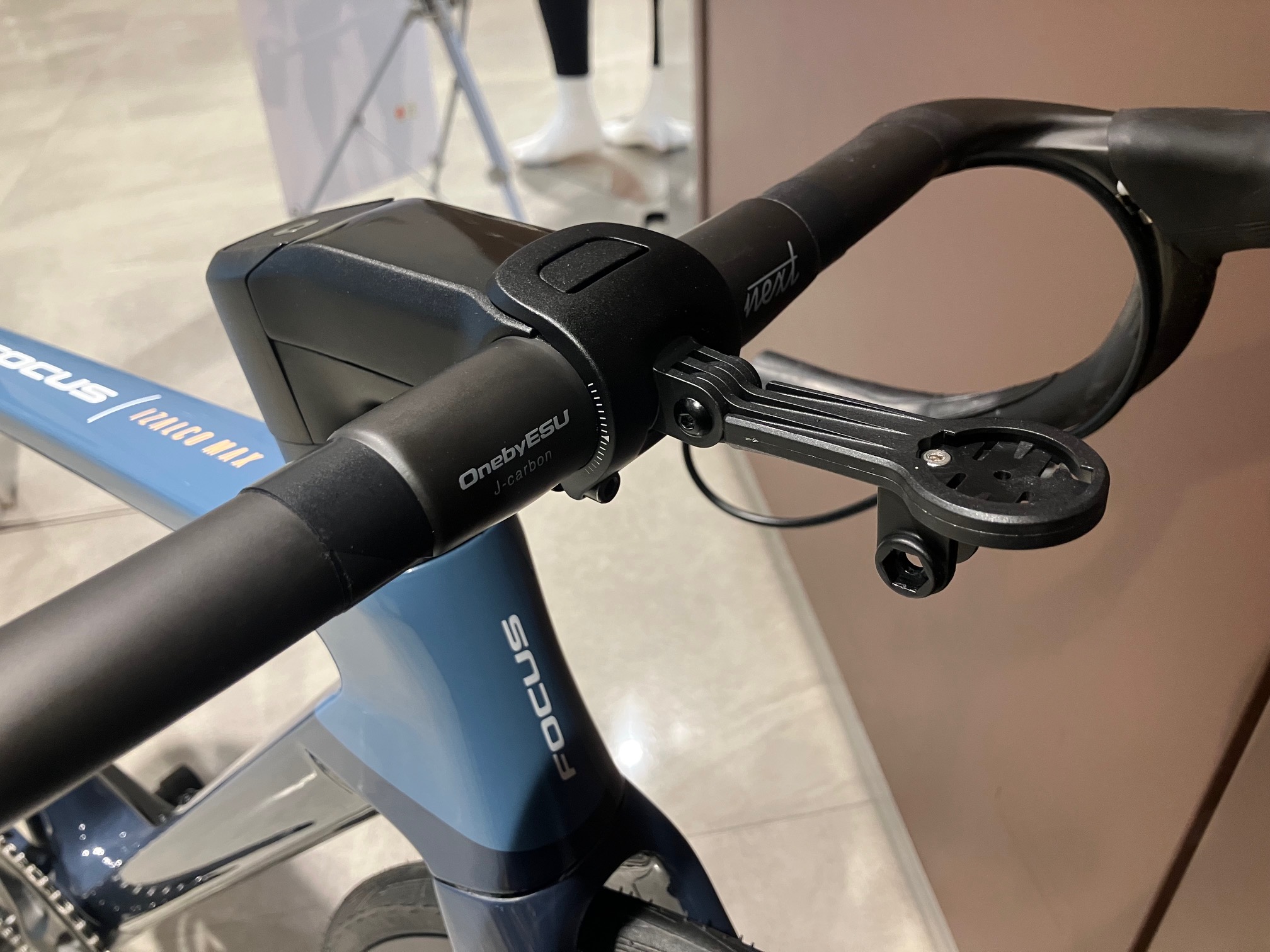 専用のアルミステムとOne by ESUカーボンハンドルが装着されるほかサイクルコンピューター&フロントライトのマウントも付属します。