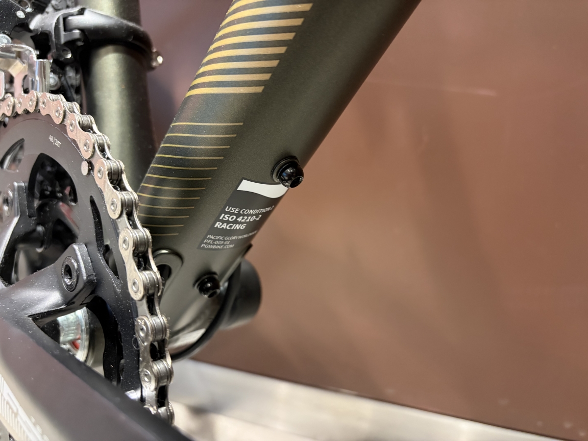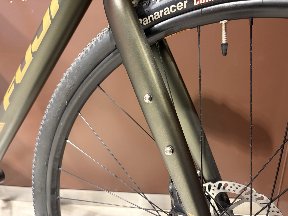 いかがでしょう、フォーク、ダウンチューブ下、トップチューブとダボ穴が沢山!これなら荷物を積む場所も困らないのではないでしょうか。フレームに関しても使われるアルミの種類を変えたりなどで、よりグラベル向けの性能となっております。さらにはタイヤはデフォルトで太めの38Cと、もうこのままグラベルバイクとしても使えちゃいますね。