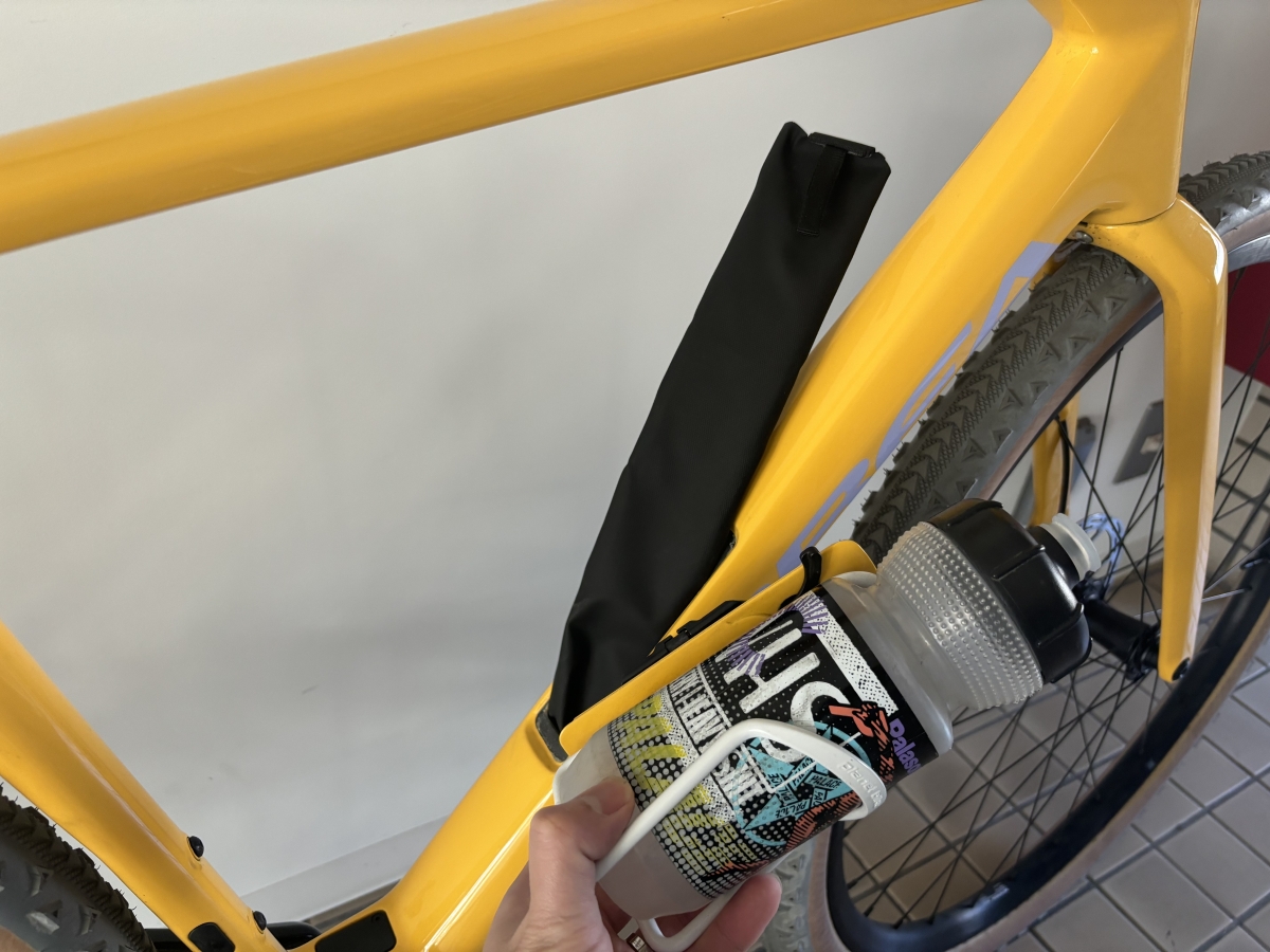 ダウンチューブには収納スペースがあります。しっかりと今っぽいつくりになってますね。専用の袋が付いていてそこにポンプや予備のチューブを入れられるようになっています。エンド金具を使わないタイプの輪行袋も入りそうです。ソーセージの乗った菓子パンをねじ込んでライド時の補給食にもできました。使い方はまだまだ模索中です。
