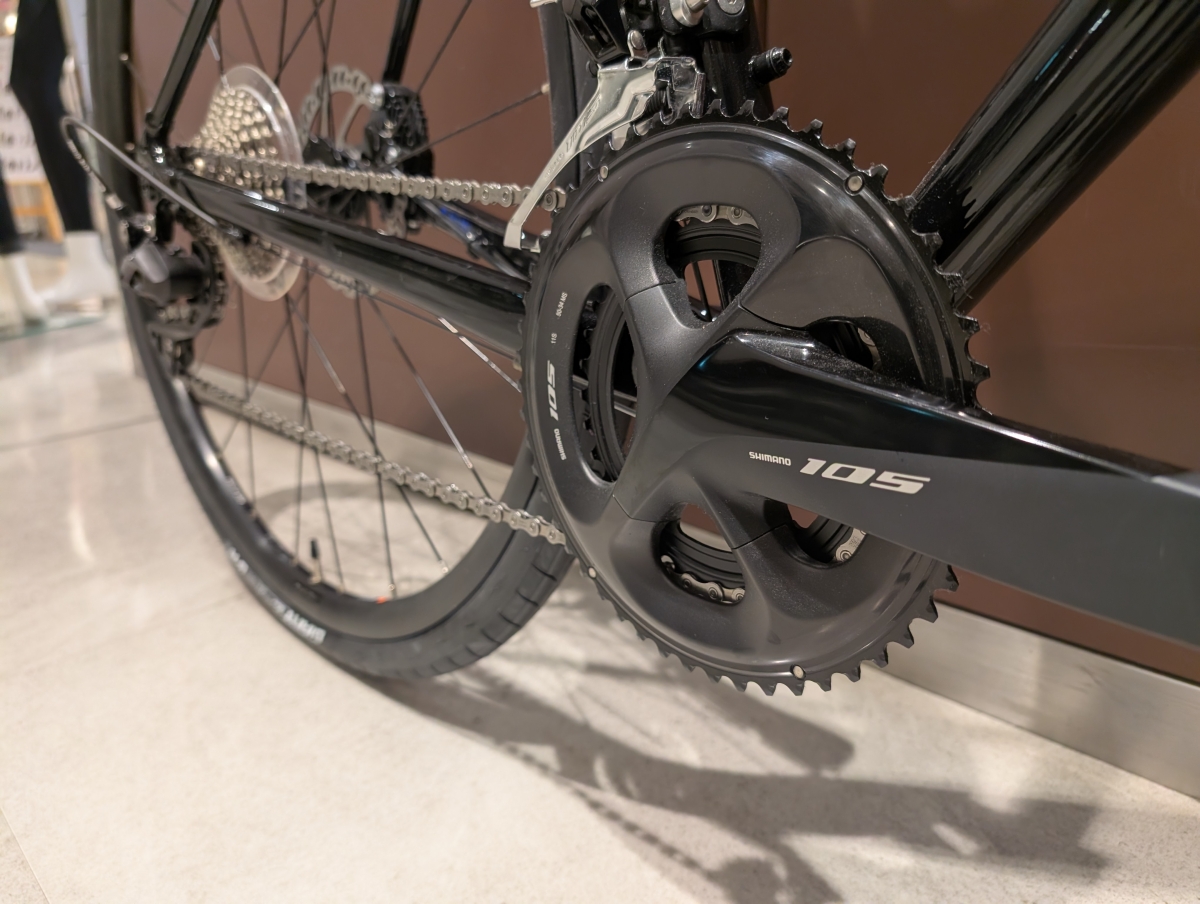 通常メインコンポーネントはシマノクラリスですが、この車体はシマノ機械式105 11Sがアッセンブルされております。リアの変速段数が8段から11段になり、より多くの地形に対応できます。