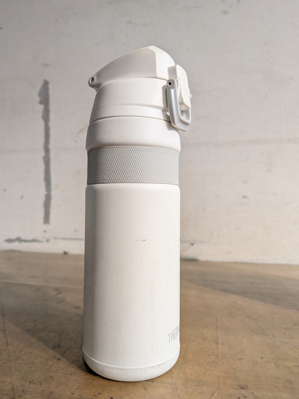 私がロードバイクを乗る前から使用しているもので、愛着もあるのでそのまま使用してますが、もし “自転車に乗る皆さんが新規で購入する” ということであれば、やはり片手でフタを外し、そのまま飲めて、ボトルケージにもフィットする “THERMOS ウォーターボトル FJF-580″ をのような商品を推しますね。