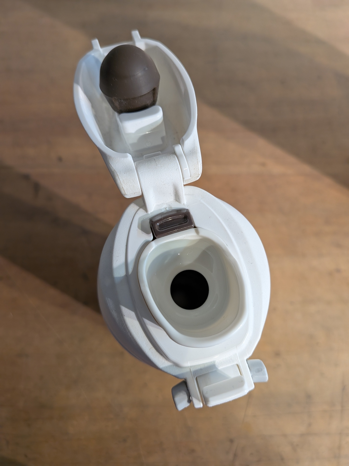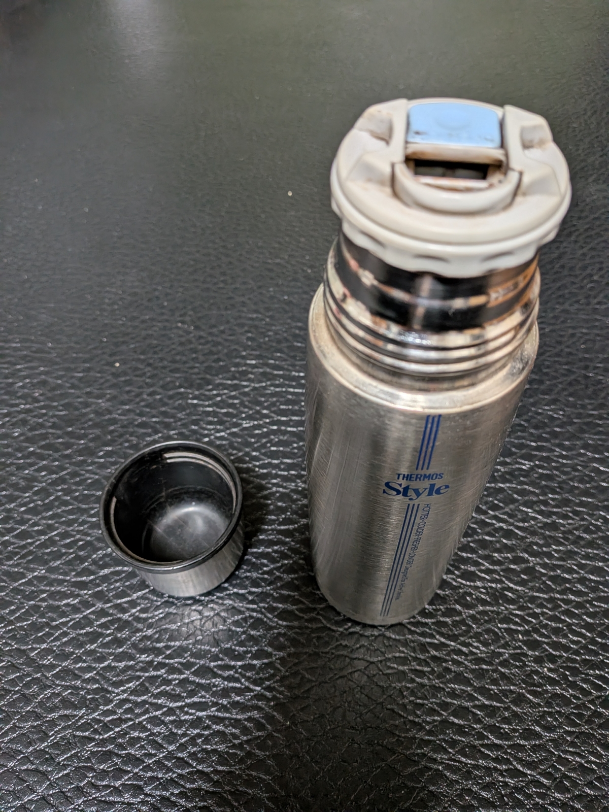 ところで、私の THERMOSは、コップを兼ねたフタに注いで飲むタイプ。登山用ですね (ちなみに容量:0.45L) 。。。