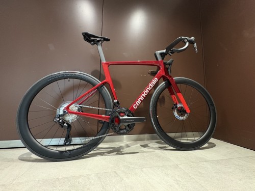 まず簡単にですがこの車体の説明をさせていただきます!SuperSix EVO は、軽量なエアロロードバイクで登れるし平坦でも活躍できるバイクとして作られました!全体的にチューブ形状をカムテール形状にしたり、シートポスをUCI規定ぎりぎりまで薄くするなどメーアーのこだわりを感じられます!フレームに関しましては3種類ある中の下位ノーマルモッドになりますがノーマルモッドでも、実業団レースなどでも入賞できるポテンシャルを秘めたモデルとなっております!また乗り心地も上位グレードと比べると比較的に柔らかいモデルとなりますので長距離のライドでも重宝するのではないでしょうか。