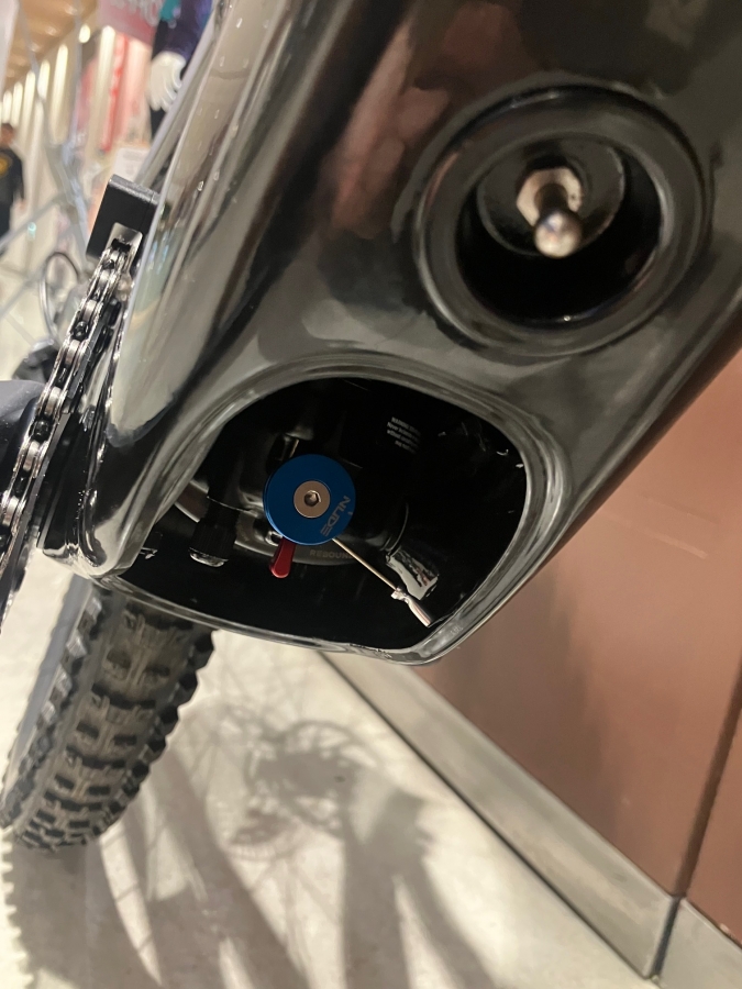 フレーム下部のカバーを外すことで簡単にリアショックにアクセス可能。サグ出しなどはリンク部に設けられたインジケーターで簡単に確認できます。