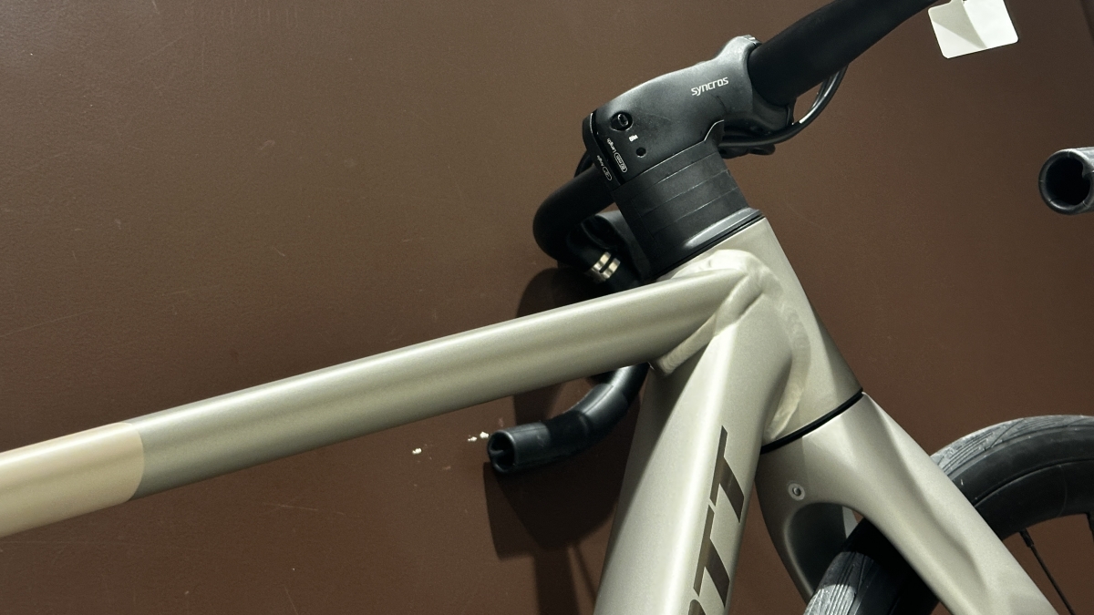 このバイクの最大の魅力は、アルミフレームでありながら、ケーブル類がほぼ内装になっている点です。 ハンドル周りからフレームに入るワイヤー類が露出していないため、非常にスッキリしており、まるで上位グレードのカーボンバイクのような高級感があります。これにより空気抵抗が減るだけでなく、ワイヤーの汚れや錆びも防げます。この価格帯のアルミロードバイクでここまで徹底して内装化されているモデルは貴重です。
