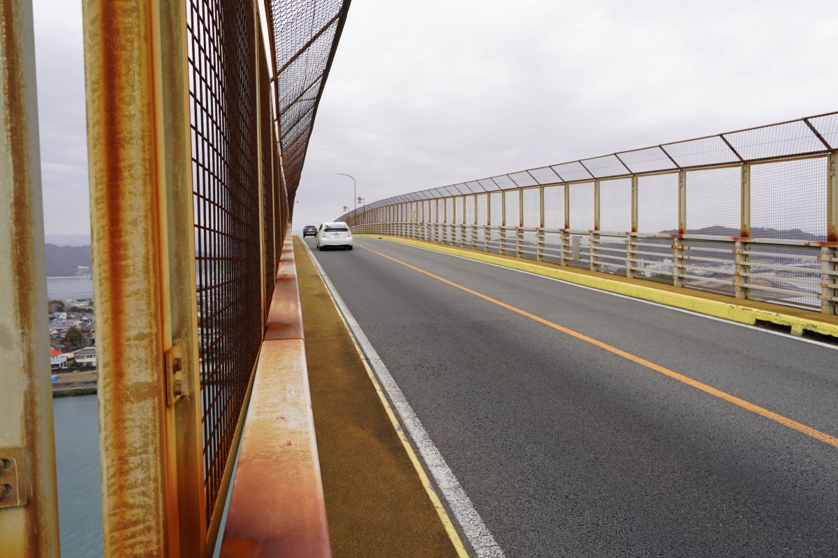 景勝地の桂浜に近い浦戸大橋。この湾口から高知市街へ海が入り組んでいるのですが、ここまでの道の太さに対して、この橋、急に細くなったんですけど。歩行者のすれ違いもできないですよ。