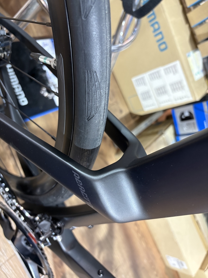 細くボリュームのある印象のフレームデザインはキープコンセプトのように感じますが、全体的に角が丸くなり、またタイヤ周りのクリアランスがワイドになり最大32Cのタイヤを許容するようになりました。ワイドリムのホイールも安心して使用できるクリアランスになっています。