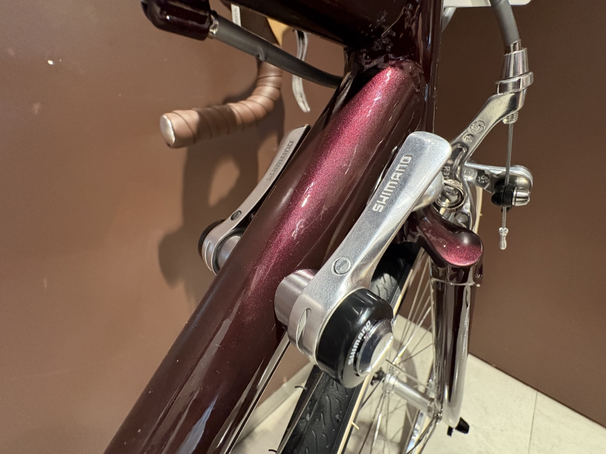コンポーネントにはWレバーを採用。ダウンチューブのレバーを倒して変速します。これによりWレバー車体ならではのシンプルさが味わえます。