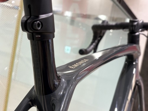 ハンドルから出たケーブルはヘッドチューブから入るセミ内装となっていまして、見た目も綺麗で、空気抵抗の削減にも繋がっています。