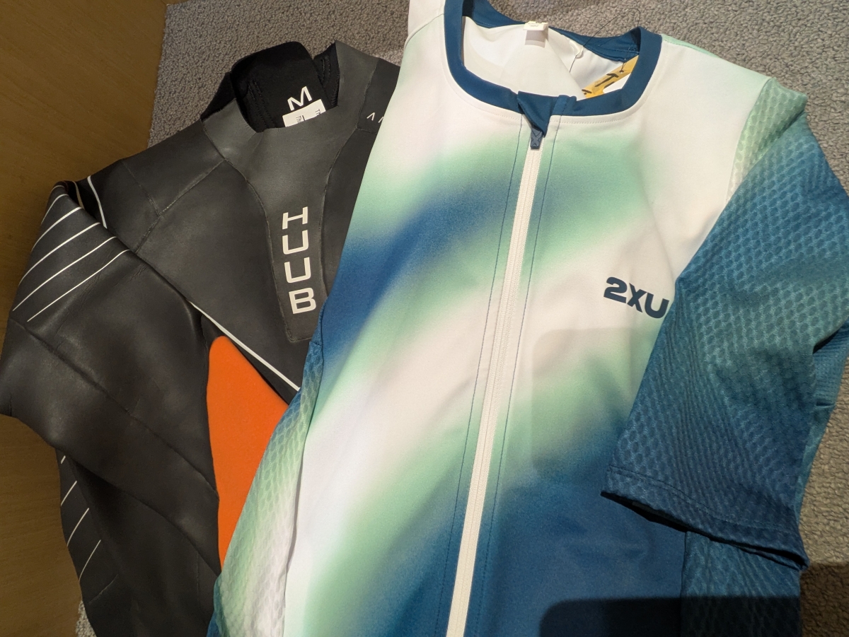 パッと見ウェア館に並んでいそうなこちらのトライスーツたちですが、実はトライアスロンの必需品なのです。