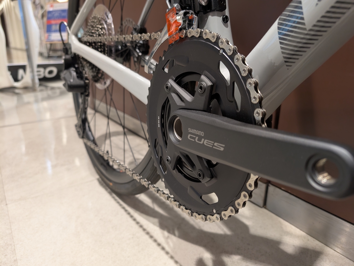 コンポーネントはシマノCUESがアッセンブルされており、2×10の20段変速の物がアッセンブルされております。とくに耐久力に優れており、通勤通学などの日常使いから週末のサイクリングまでオススメです。また油圧ディスクブレーキが搭載されているので長い下り坂や力の弱い方も安心して使えます。
