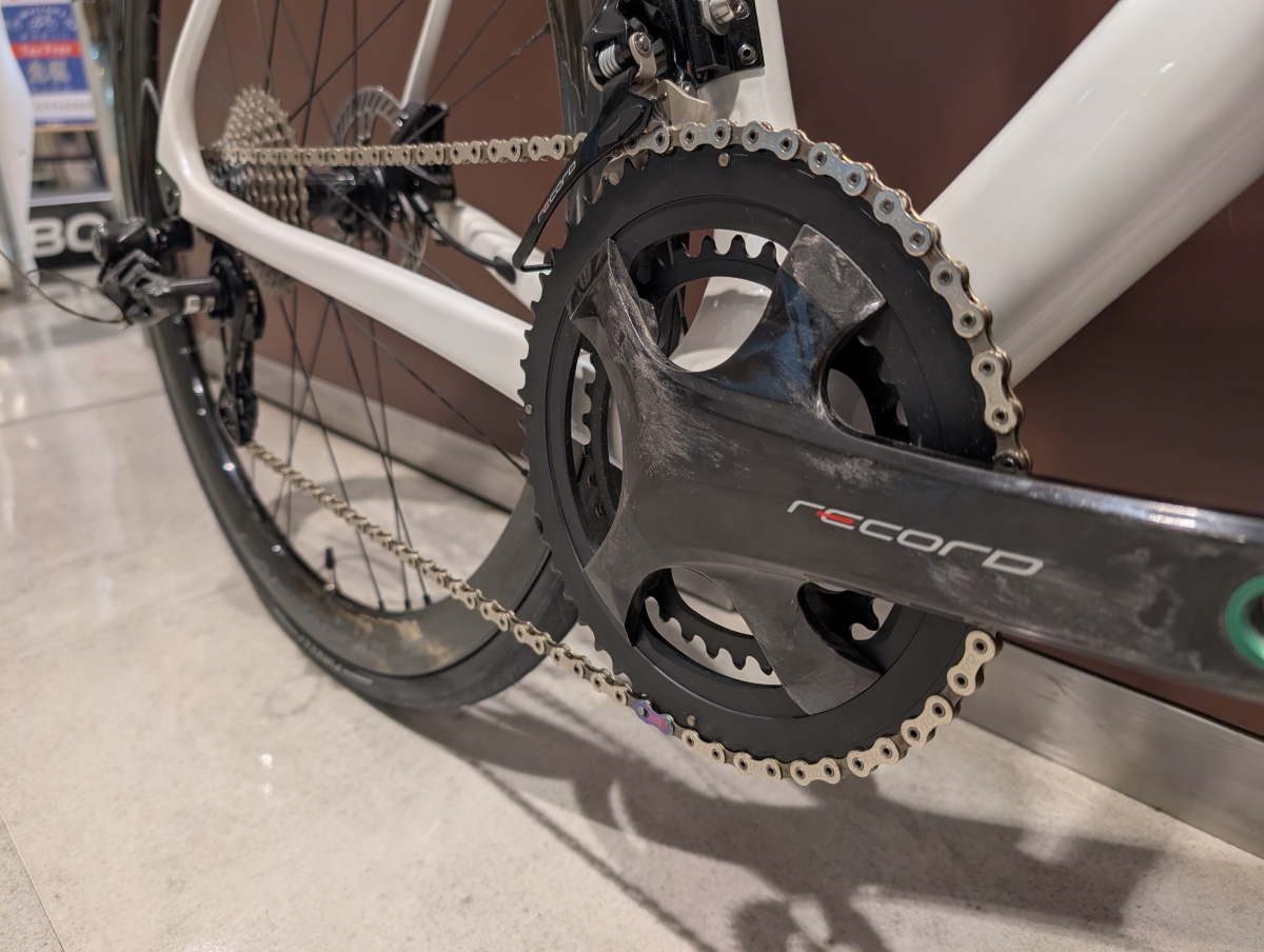 コンポーネントはCampagnolo RECORD 12Sをアッセンブルしており、見た目の美しさや操作感などシマノやスラムとはまた違う愉しさと魅力があります。とくにエルゴパワーはこのためだけにCampagnoloを使うという人も多く、エルゴパワーでシマノのRDを引くためのアイテムが非公認で複数発売されているほどの逸品です。
