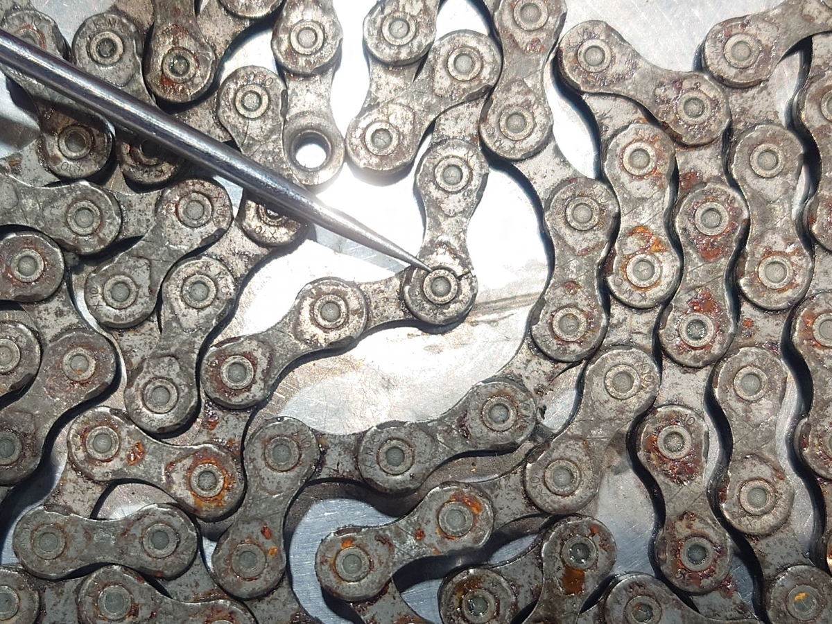 チェーンが汚れたままだと、オイルがあっても砕けた石などが研磨剤になり、摩耗を促進。