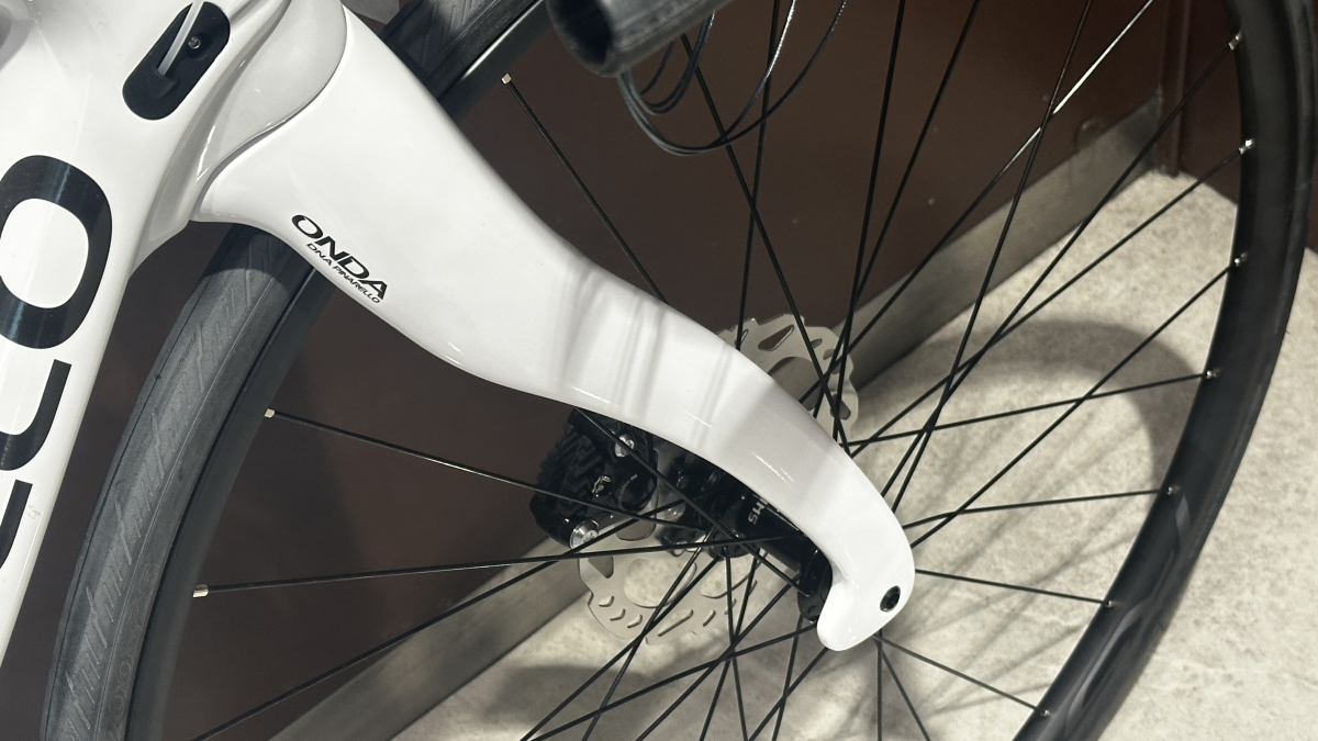 PINARELLOのアイコンともいえる特徴的なONDA フォーク。この逆S字を描く独特なフォーク形状は、正確な旋回性、安定性、縦・横方向の衝撃の軽減を実現しています。