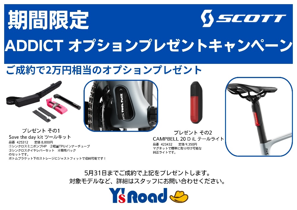 2026年度モデルのADDICT(エンデュランスモデル)を20026/5/31までに、ご成約頂くと両方が入手可能なキャンペーンとなっております。