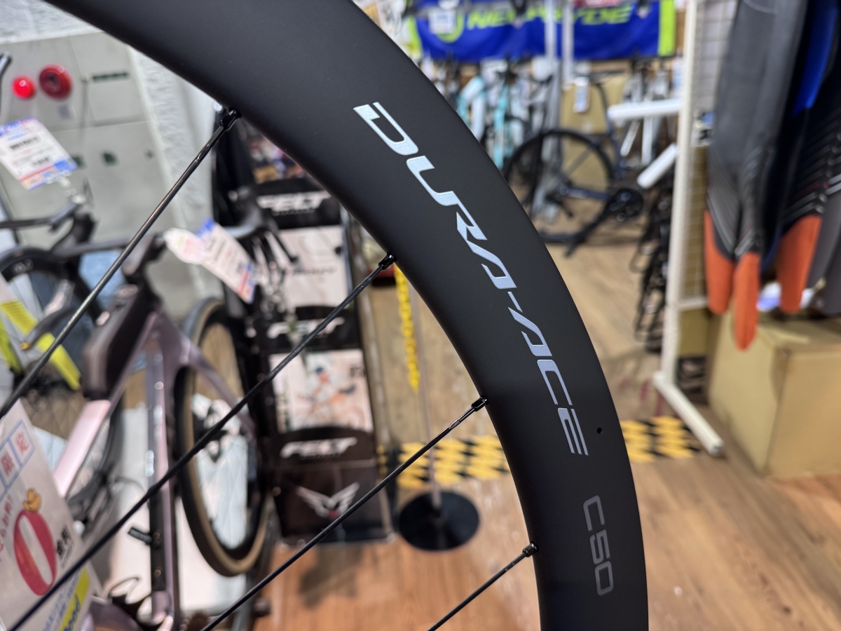DURA-ACEのホイールはロゴのサイズ、カラーとなどシンプルなデザインになっています。シンプルが故に色が合わず使いづらいなど起こりづらく、様々なバイクにしやすくなっています。