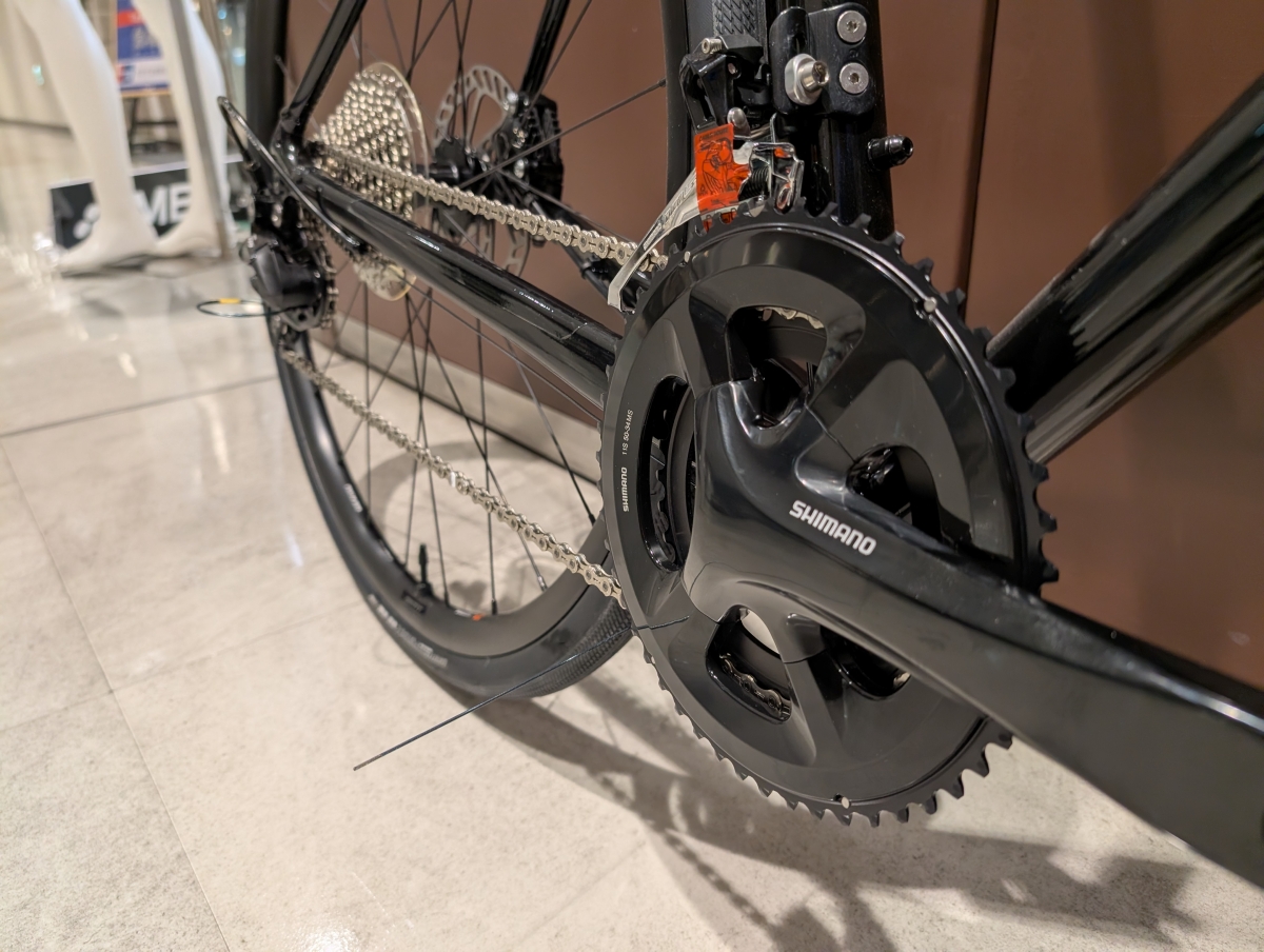コンポーネントはシマノ105機械式12Sで油圧ディスクブレーキとなっており、急な下り坂や雨の日でも軽い力で安定した制動力を発揮してくれます。