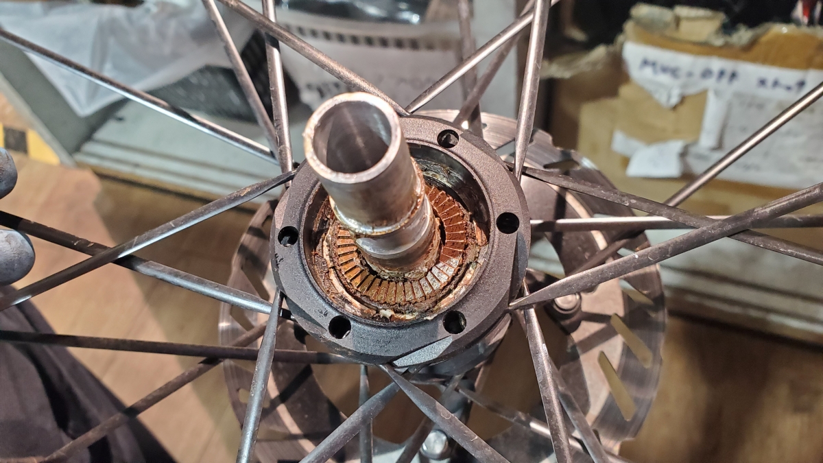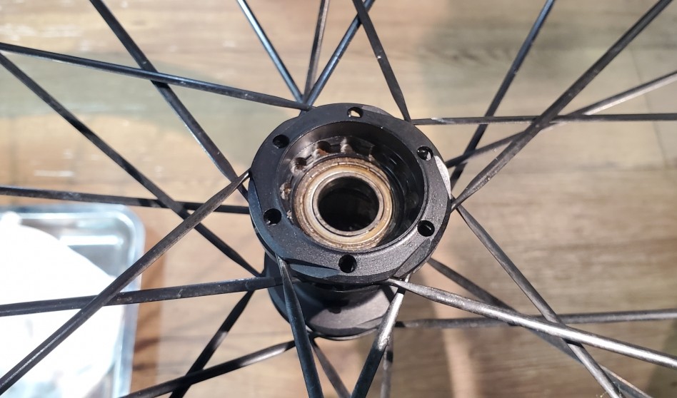 続いて真ん中のシャフトを外すとベアリングにアクセスできます。こちらもよく見てみると表面がさびており、回転させてみるとグリスが抜けざらざらとしていたので交換です。ホイール用のベアリングプーラーを用いて左右の古いベアリングを取り外します。