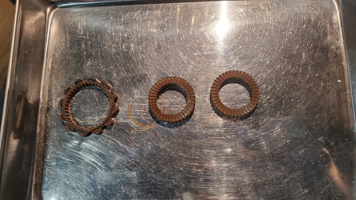 まずフリーボディを外してでてくるギザギザのわっかが重要なラチェット部分です。ペダルを漕ぐと左右のパーツがかみ合い、足を止めると滑って空転する仕組みなのですが、ここがさびているとフリーボディとの摺動部で引っかかってしまい、ペダルを漕ぎだしても左右のラチェットがかみ合わず空転してしまうことがあります。通常錆を落とすとなると錆を削ることになりますが、駆動力を伝える重要な爪を削ってしまうとこれもまたギア飛びなどの不具合を起こす可能性がある為、基本的には錆びたら交換となります。