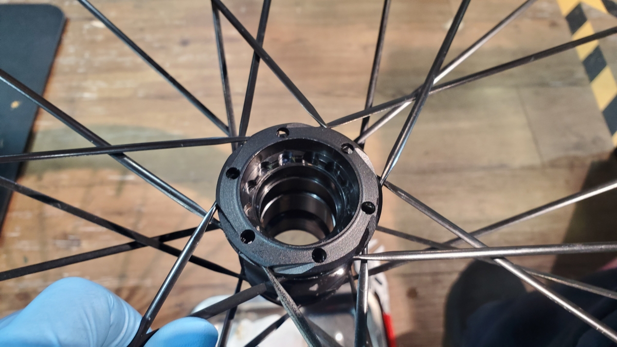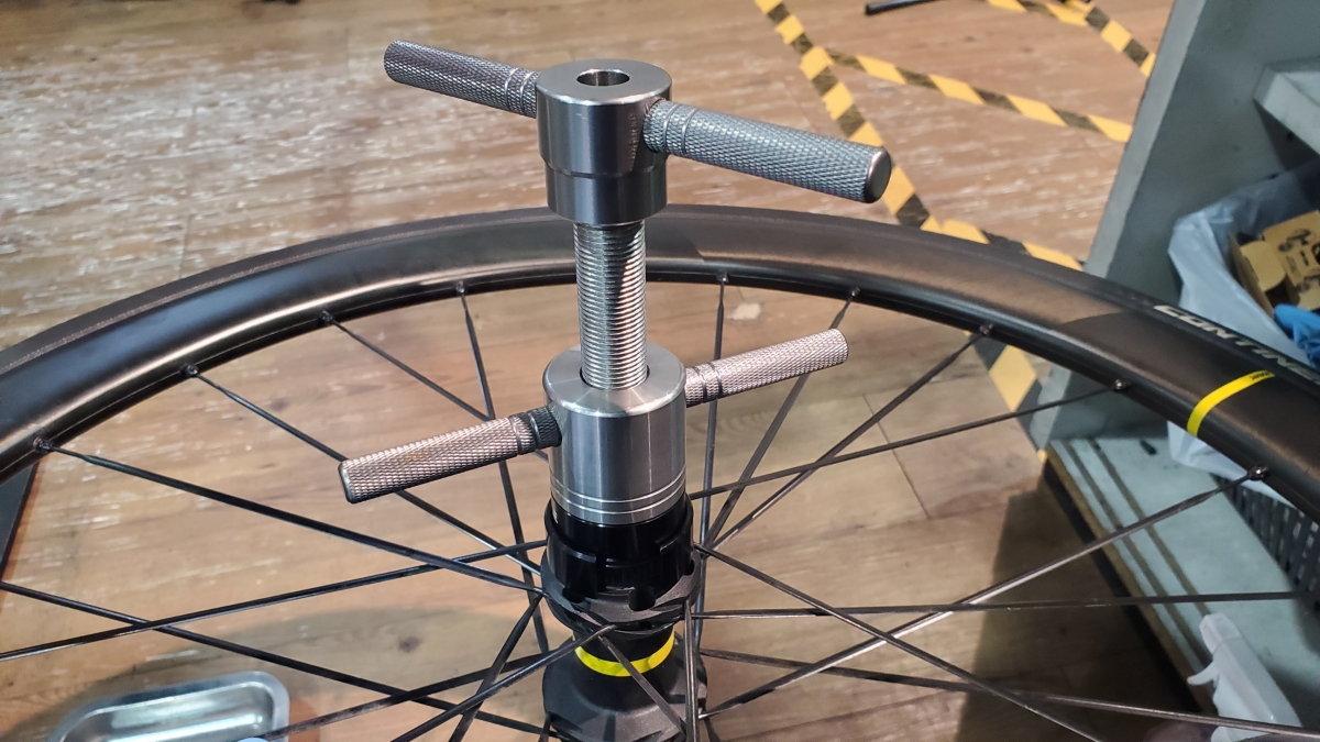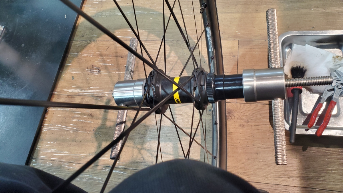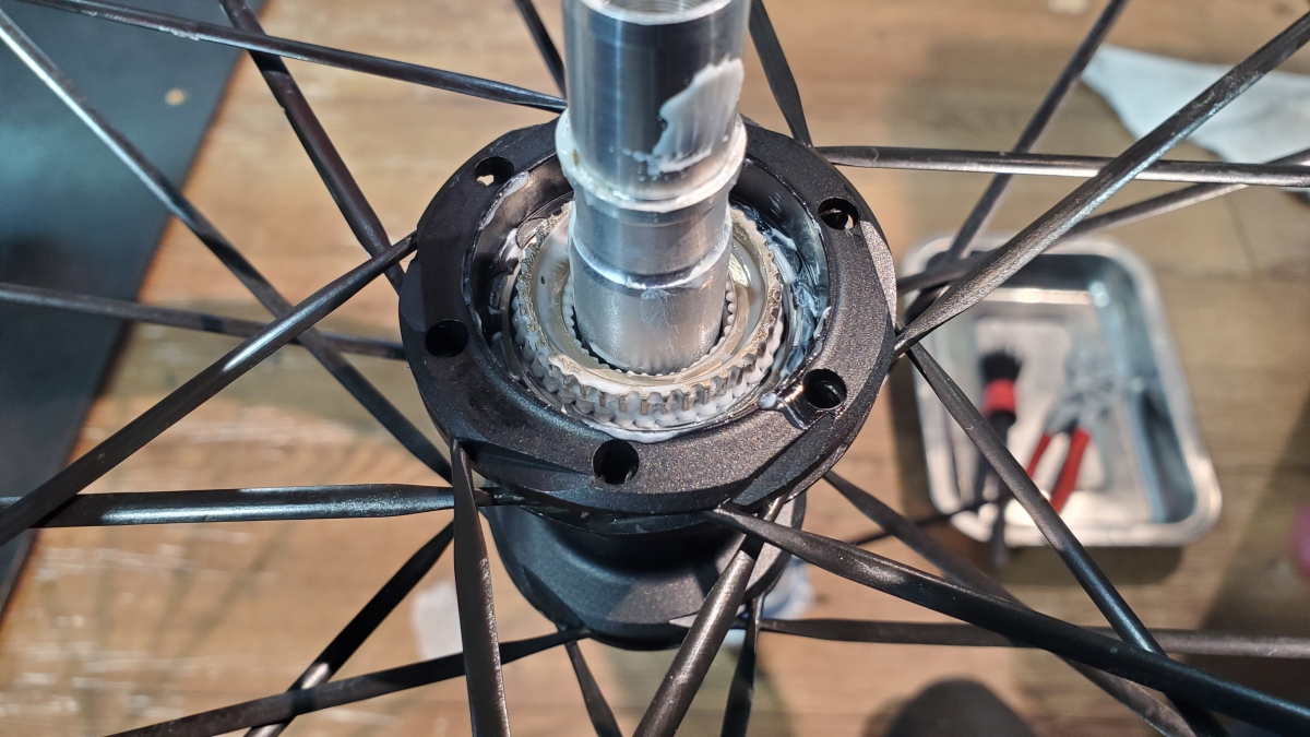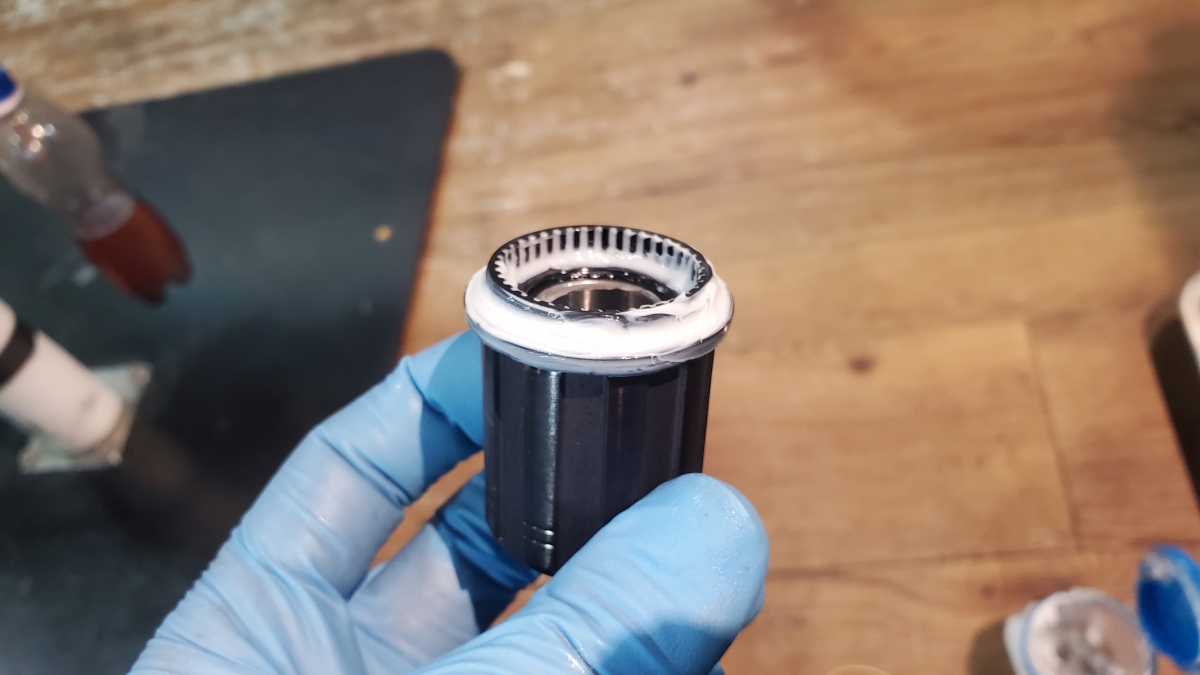 そしたらハブシェルをきれいに洗浄。その後薄くグリスを塗布して専用工具で新しいベアリングを圧入します。