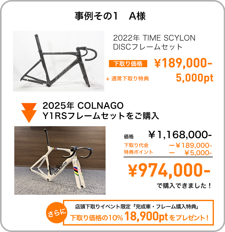 3. ワイズロード各店舗で行われる出張買取り会場で完成車・フレームを売却後、ワイズロードにて完成車・フレームを購入されることをバイチャリスタッフにお伝えいただくと、完成車・フレーム購入時にポイント付与できる売却金額10%分のY’sClubポイント引換券を発行いたします!