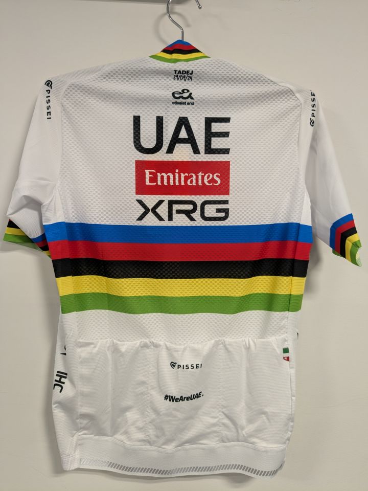 2024年シーズン、タディ・ポガチャル選手が史上3人目のトリプルクラウンを達成した、記念すべきアルカンシェルジャージのレプリカが入荷しました。