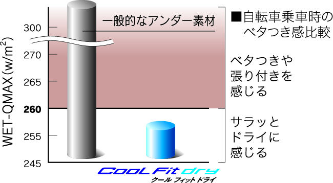 濡れた素材を肌に当てた際に感じる冷温感を評価値として比較。数値260を境に、ベタつき感や張り付き感を感じる。クールフィットドライなら多量の汗をかいても肌離れ性に優れ、不快なベタつき感や汗冷えが少ない。(商品パッケージより)
