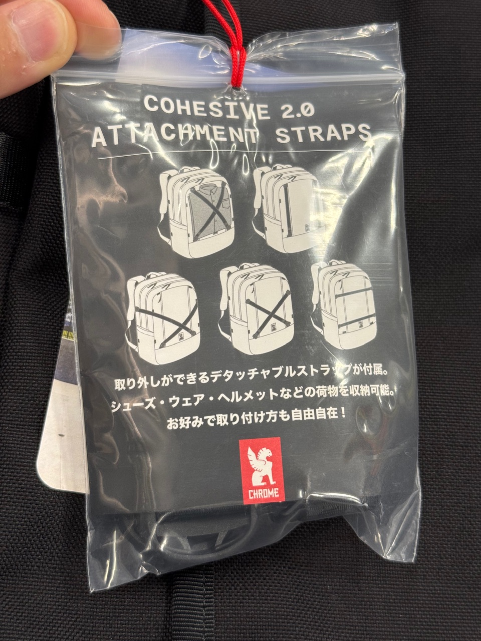 付属のストラップで入りきらない荷物をバックに固定することができます。固定するものが無くてもカッコ良いので付けときたいですね。