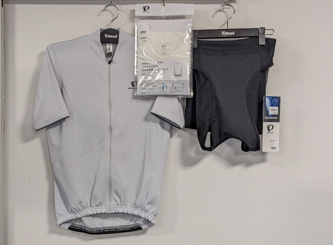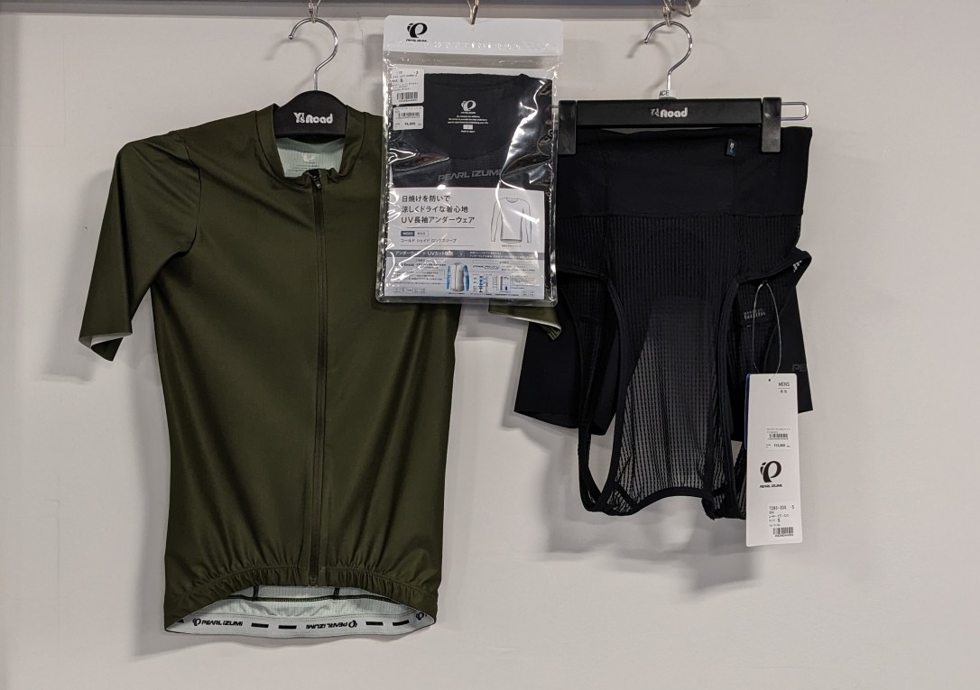 例えばこのセット。定番のパールイズミの3点で、タイトなレースフィットの入門ジャージと本格的なビブ、日焼けが気になる方向けのロングスリーブインナーのセットです。