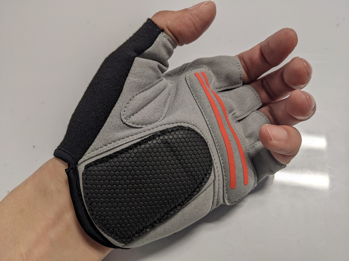 これまでのメガグローブとの違いはパッドの大きさと配置。手根付近に一番肉厚で大きいパッドを配置しています。このあたりは神経が集中している部分なので、ここにパッドを配置するメーカーが増えていますね。つけてみると存在感がすごい…ですがハンドルを握ってみると驚くほどの安心感。パッドの厚みが邪魔にならず快適な握り心地です。肉厚パッドの脇、小指球側にも沿わせるようにパッドを配置。これはフラットバーのポジションに対して機能します。