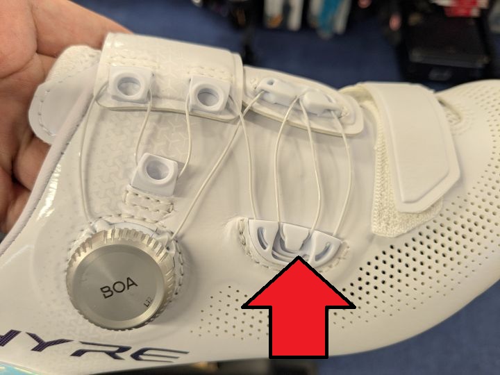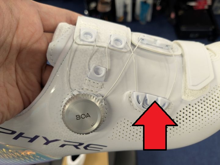 トラックでトゥークリップを使いやすくするためつま先側のダイヤルを排除し、1つのダイヤルでもホールド力を高めるためにRC903PWR専用のフラップ&ワイヤールーティーンとなっています。